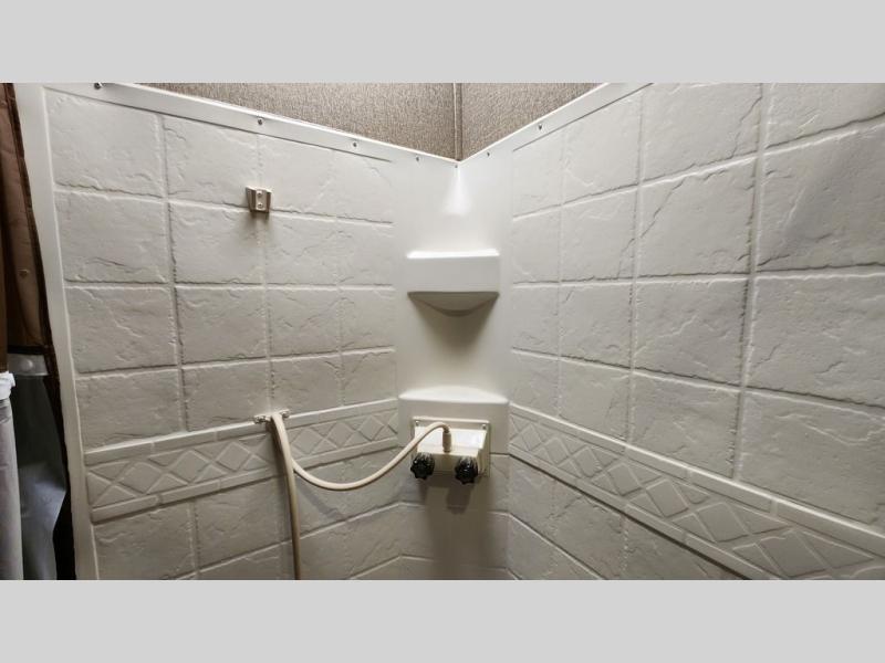 In the rear of the toy hauler, you will find two flip-up sofas with a free standing table. After your gear is unloaded this area makes for a nice area to enjoy your meals during the day, and at night you can easily convert the sofas into additional sleeping space.