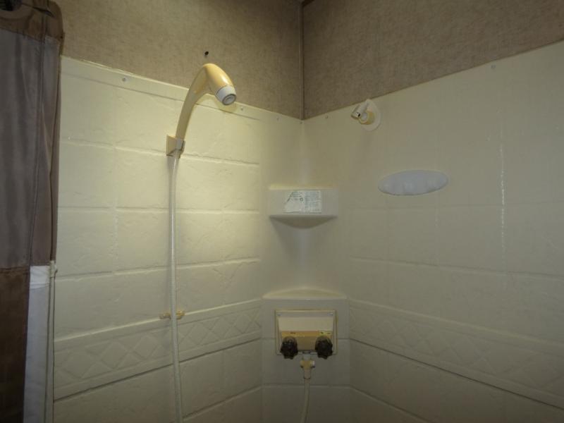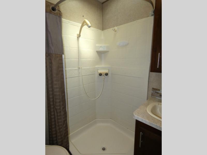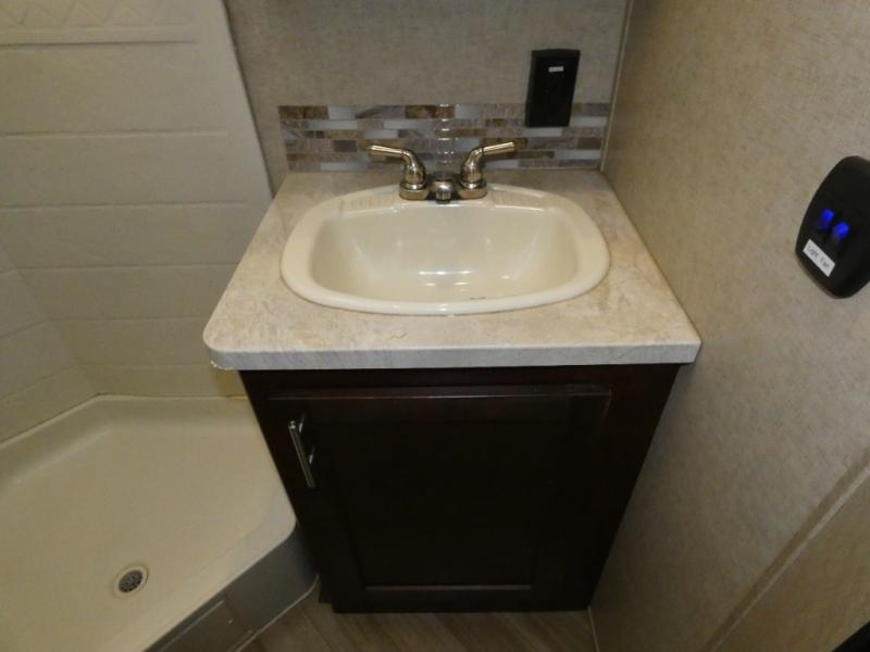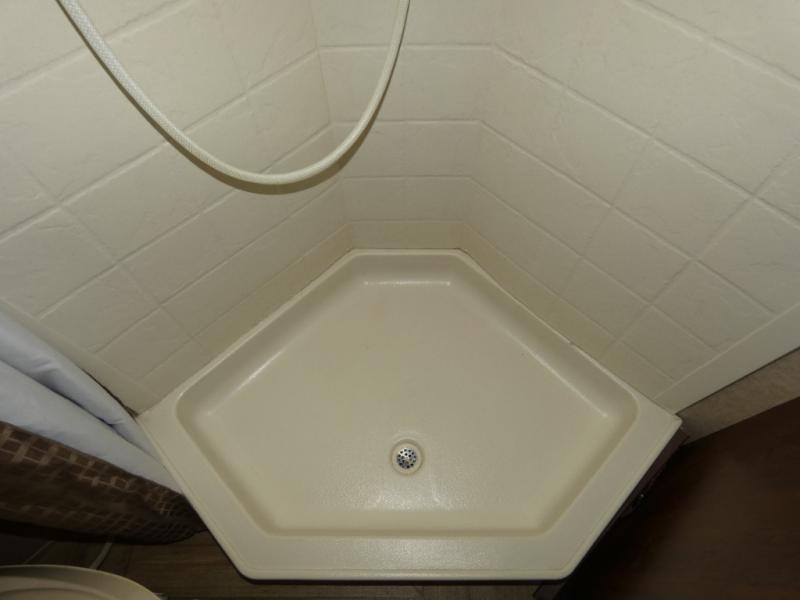 In the side aisle bath you will find a sink, medicine cabinet, neo-angle shower, and a toilet.