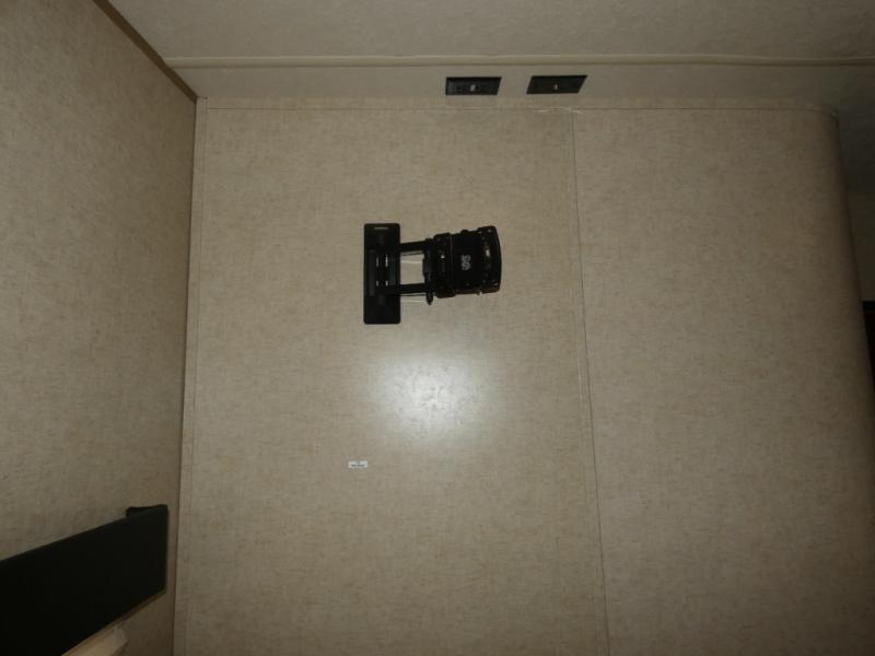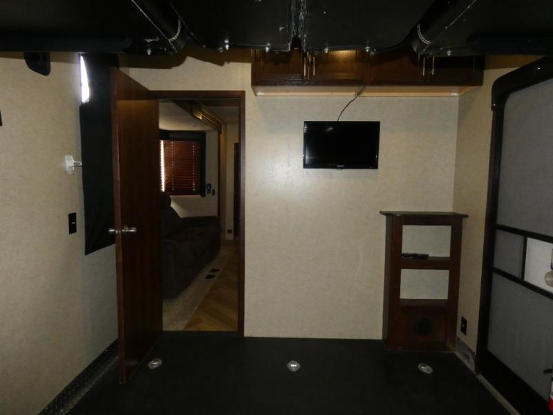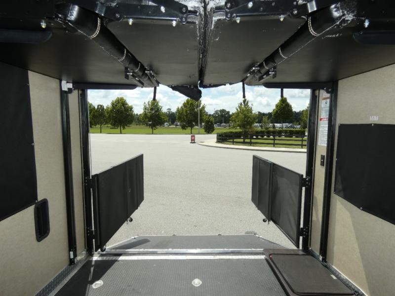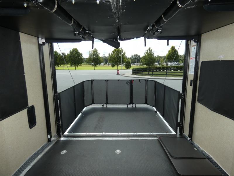 As you enter the cargo area of this Vengeance 31V Super Sport toy hauler travel trailer by Forest River you will find a large rear ramp door with lots of cargo space for your toys, a side man door, plus a TV mount.
