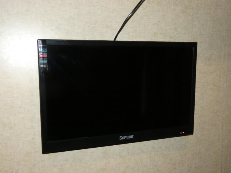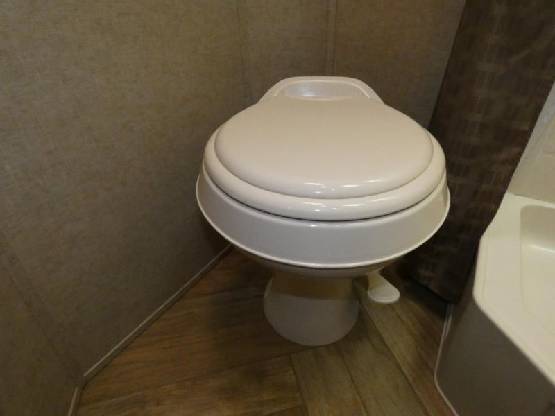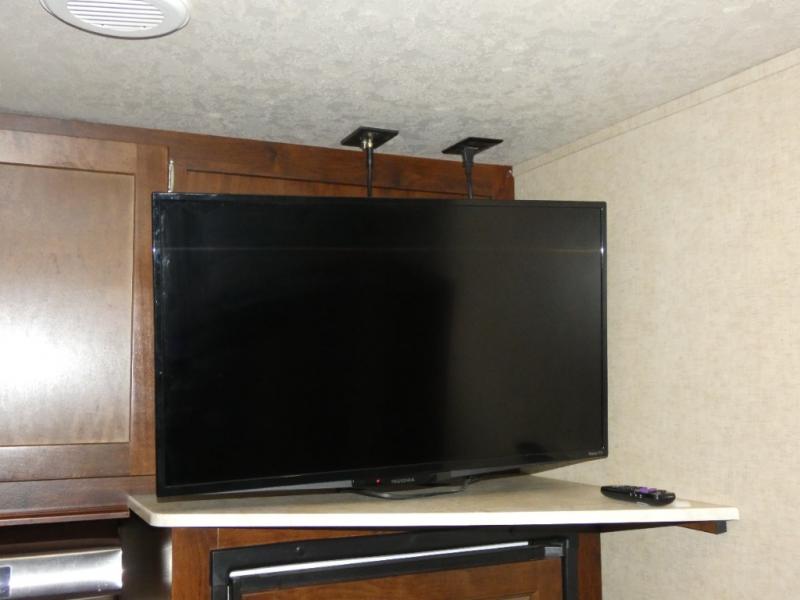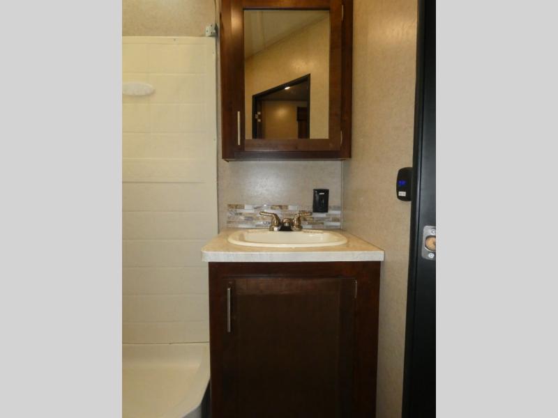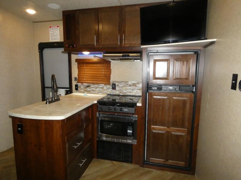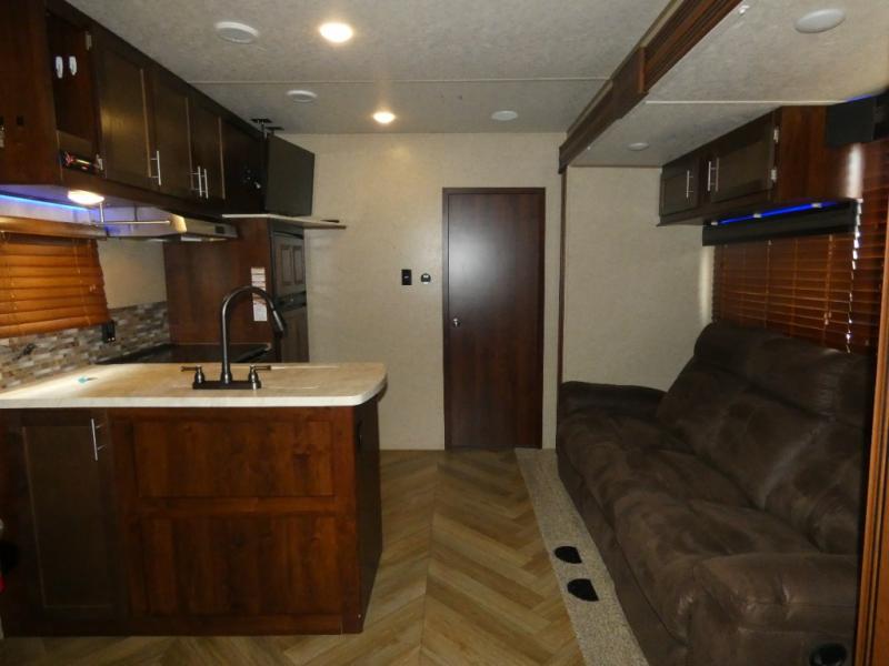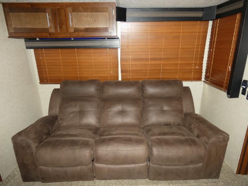 The main living area includes a slide out sofa with recliners. The TV is above the refrigerator for your enjoyment. On the opposite side of the trailer you can make your meals at the three burner range, warm up your food in the microwave, clean up your dishes in the double kitchen sink on the L-shaped countertop, and store food in the refrigerator. The main entry door is next to the kitchen amenities.