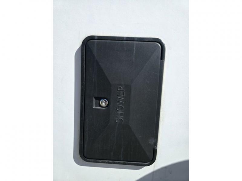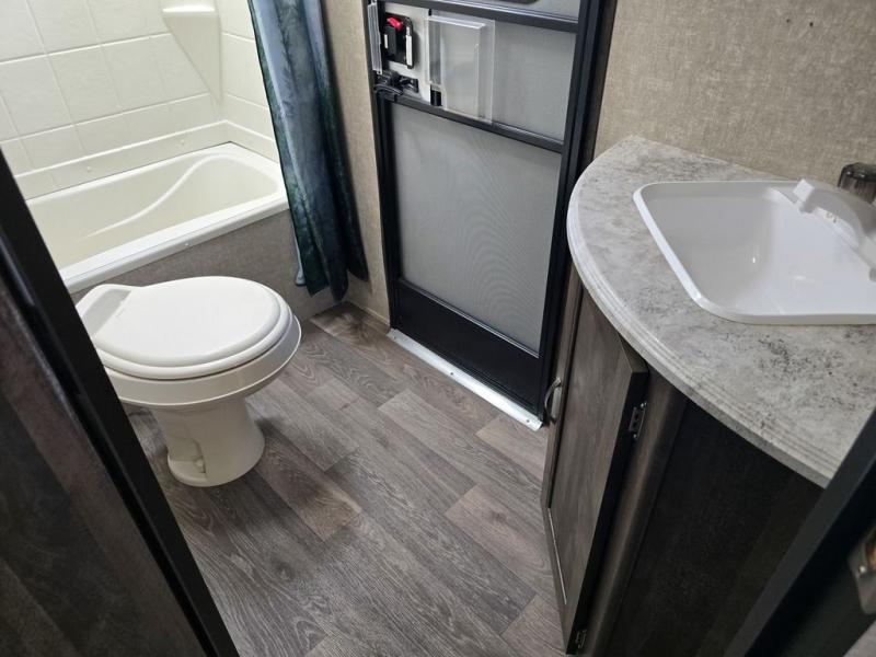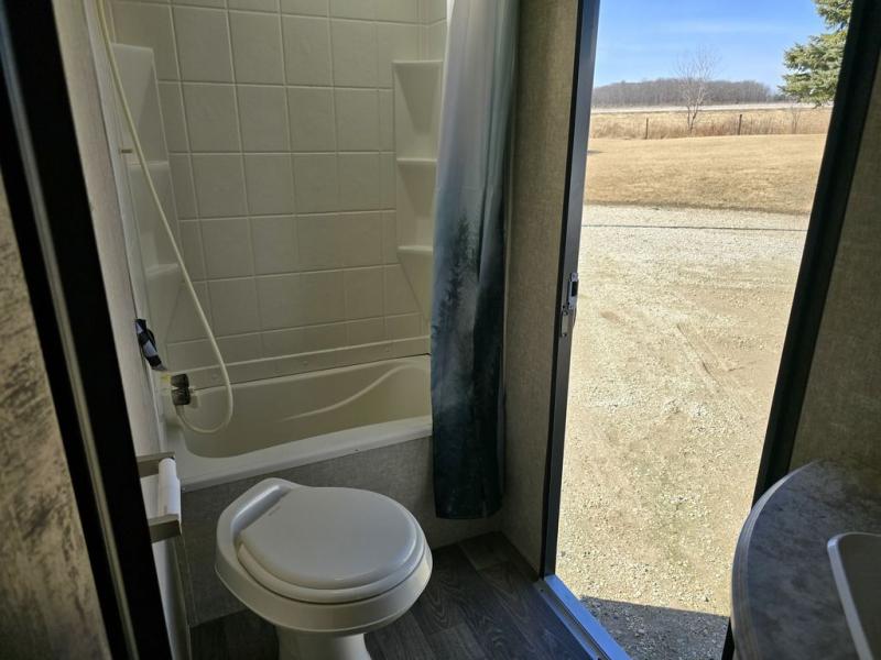 As you proceed toward the rear of the travel trailer, the double bed bunk house is on the left side. On the right side of the trailer is the bathroom. Inside the bathroom you will find a toilet, tub, sink, and medicine cabinet. There is also a private entrance from the bathroom leading outside.
