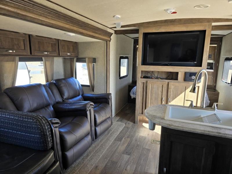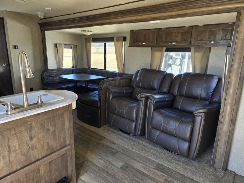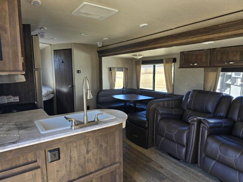 As you enter the travel trailer, to the left there is a double kitchen sink, three burner range, microwave, refrigerator, pantry, and wardrobe. Along the opposite side of the trailer you will find a slide out with a u-dinette and a jiffy sofa. Along the front of the living area you will enjoy the entertainment center.