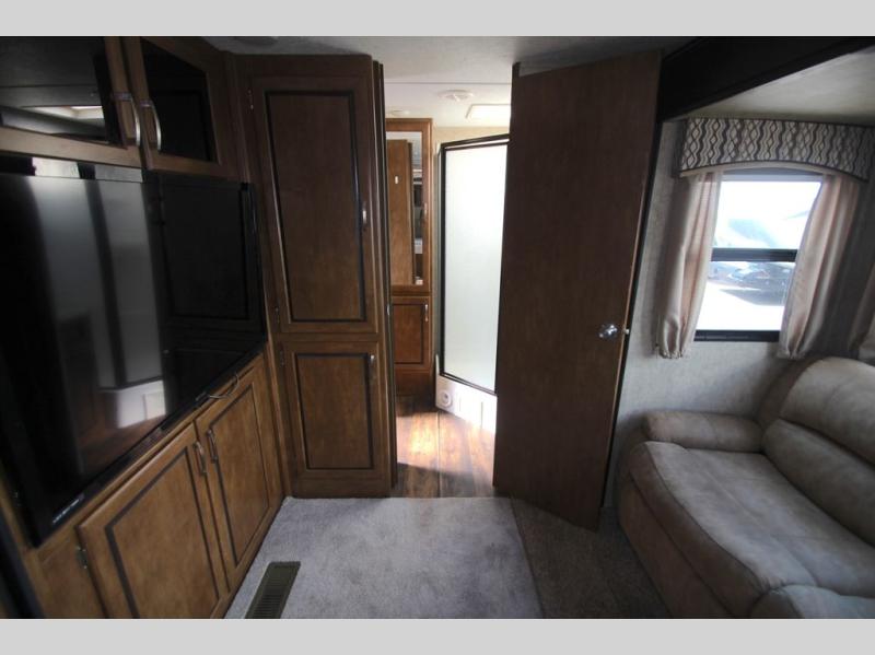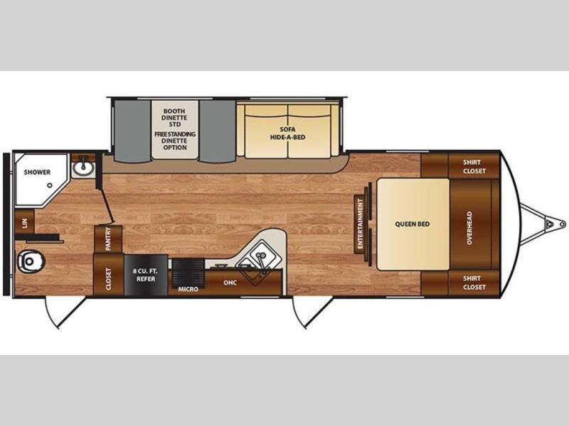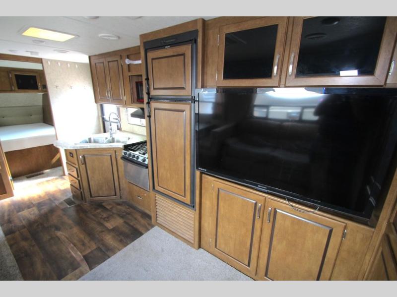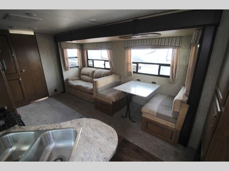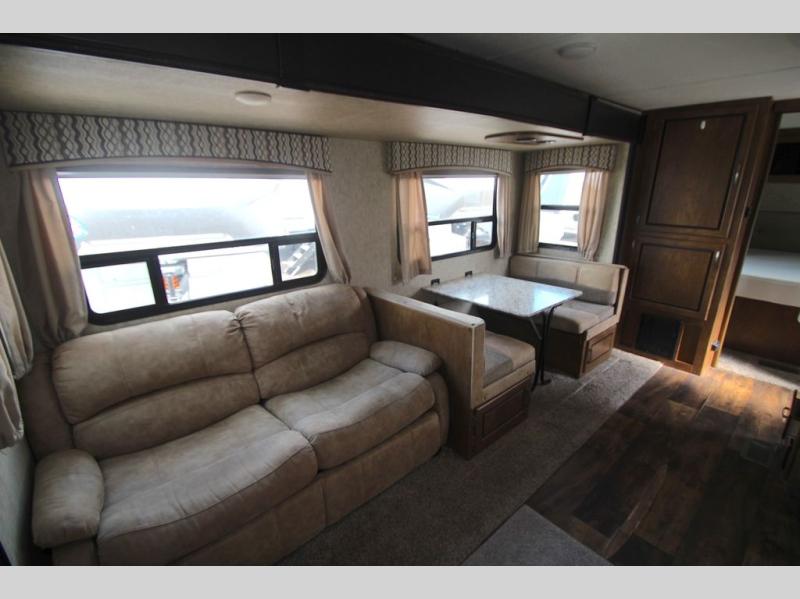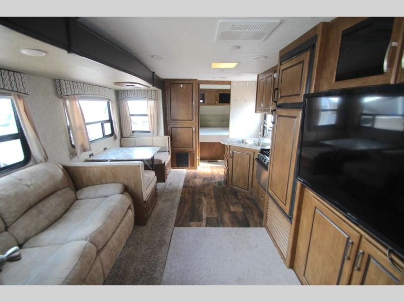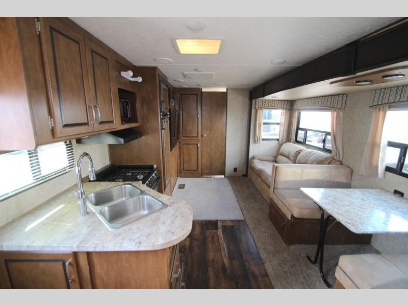 Enter the door furthest to the front and find an open combined kitchen and living space featuring a large slide out hide-a-bed sofa and booth dinette. Both provide ample seating for meals, or when you need some down time from your outdoor fun. At night you can easily make either into added sleeping space for family or overnight guests. The nearby entertainment center can be viewed by any seating in the room, plus from inside the kitchen area as well.
