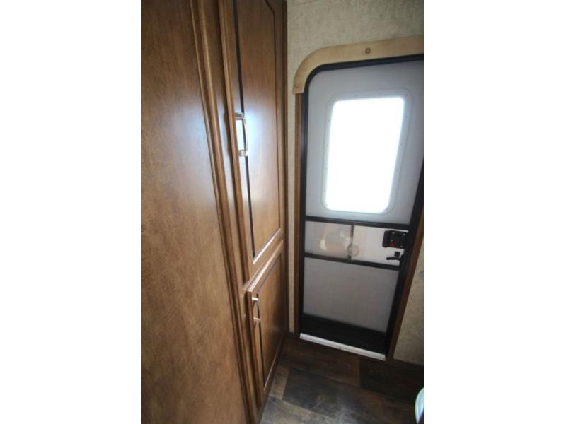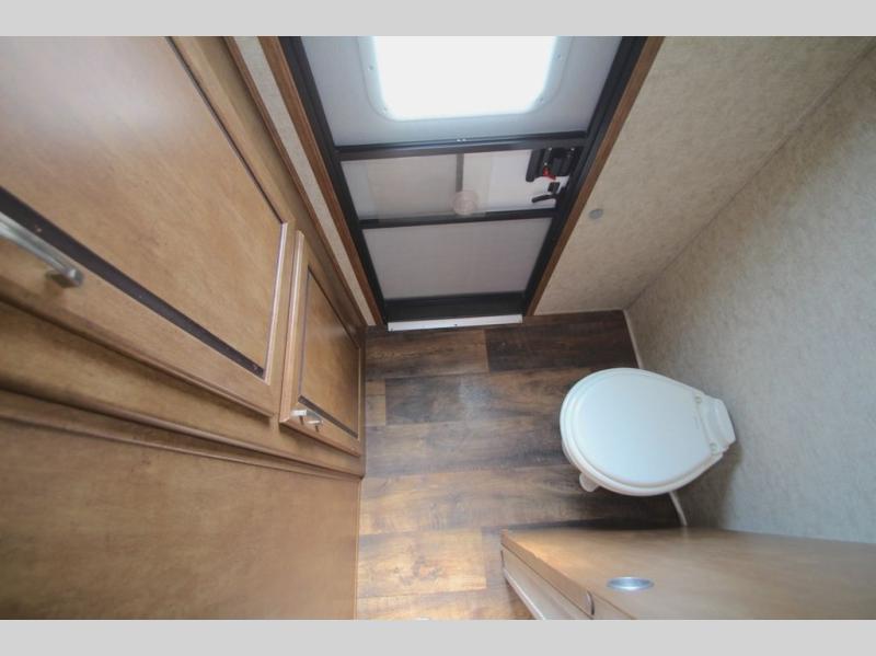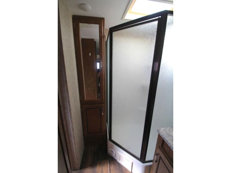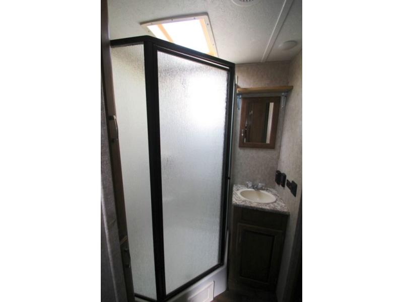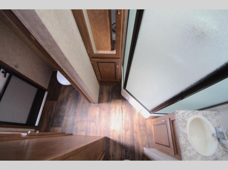 The rear bath features double entry doors so you can access it quickly from either the inside or when enjoying the great outdoors. You will love the convenience of an angled shower, a sink with overhead cabinet, plus linen storage as well. There is also a sliding door to separate the private toilet area from the rest of the bath where you will also find a closet for linens or clothing storage.
