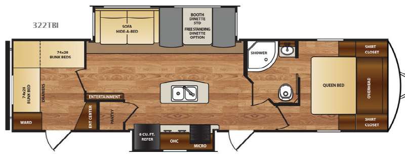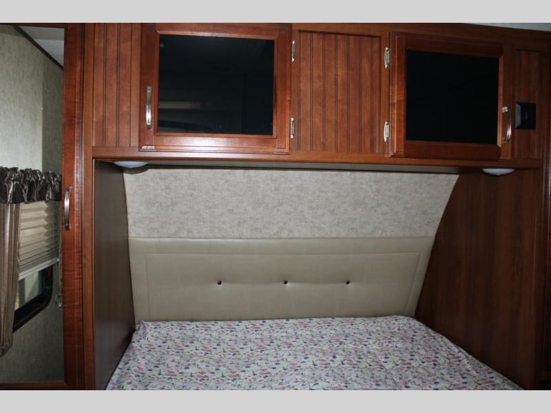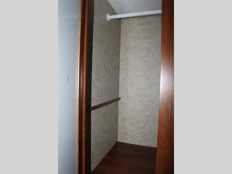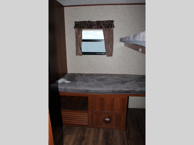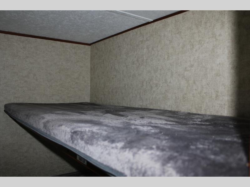 The rear of this Wildcat model features a private bunkhouse with its own exterior entry door. Inside find a wardrobe just inside the door, and an entertainment center opposite. There are also two sets of bunks that are 74" x 28" featuring lower drawers for added storage as well.