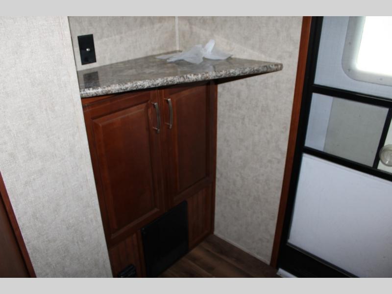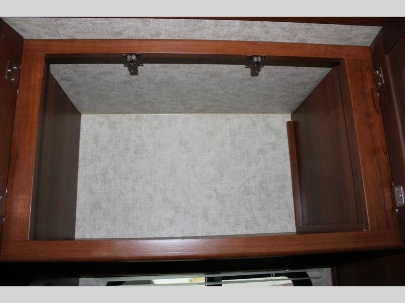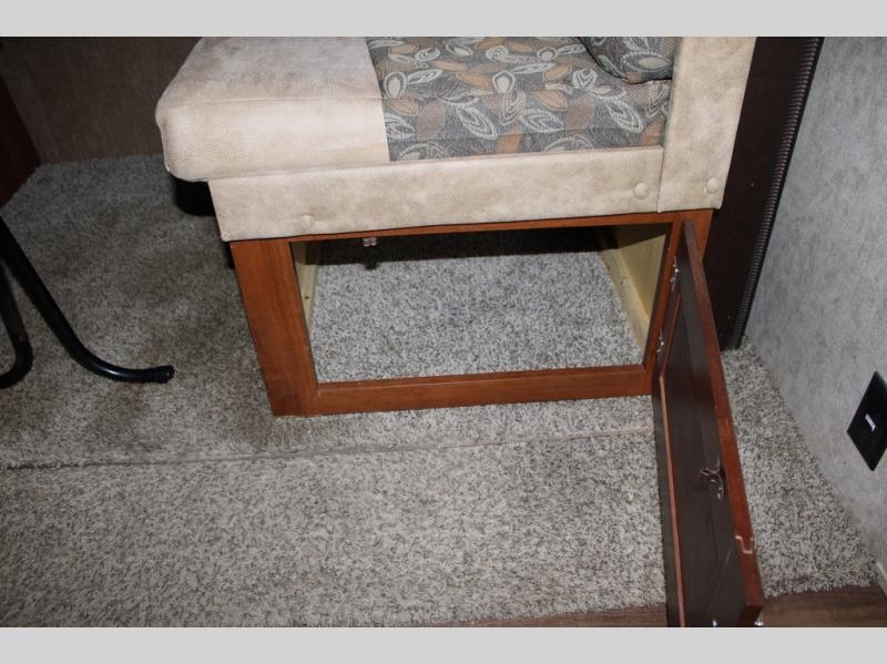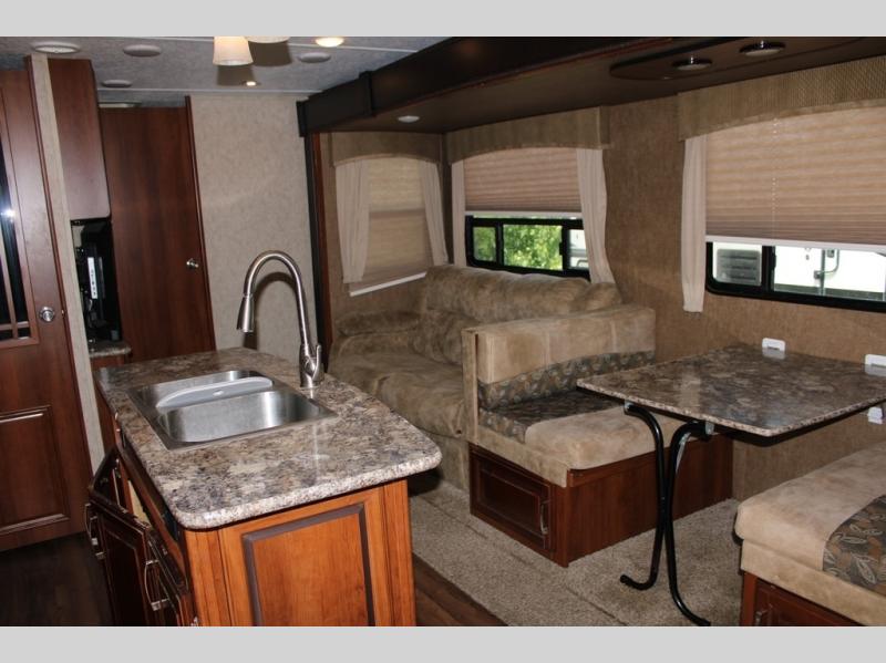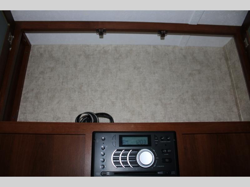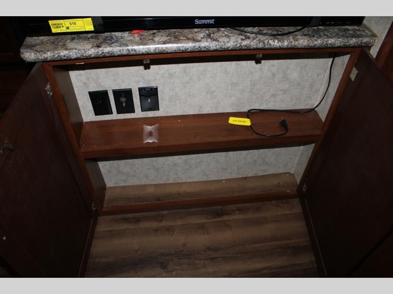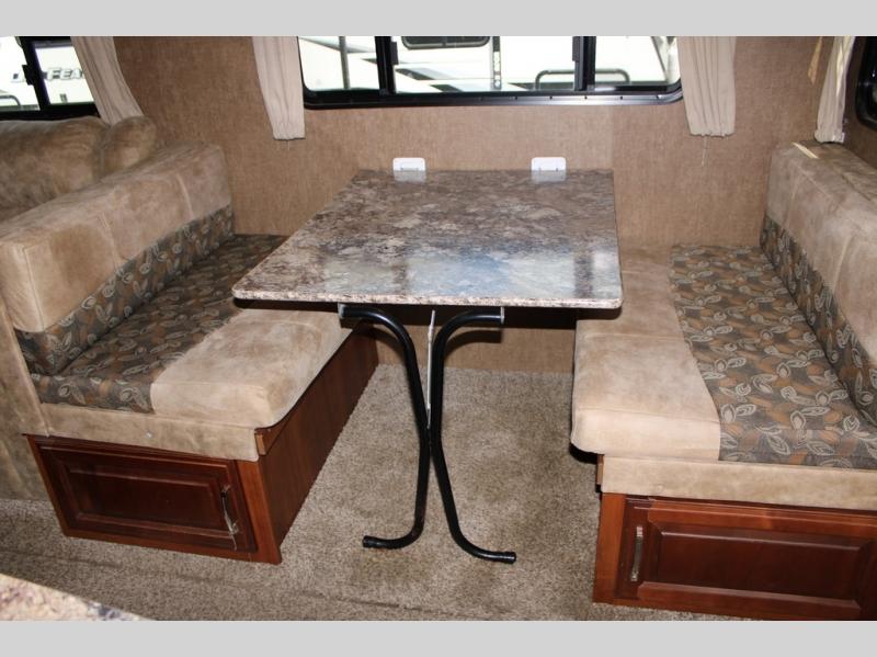 Once inside you will notice the added floor space thanks to the large slide out dinette and hide-a-bed sofa. A booth dinette is standard, or you can choose a free standing dinette with chairs. Which ever you select you will find plenty of seating for everyone. There is also a nearby entertainment center for you to view from any seating in the space.