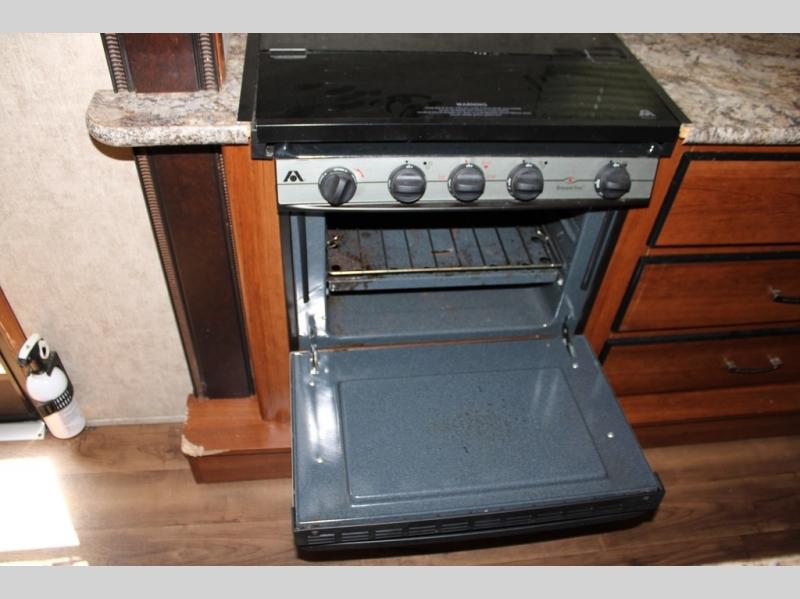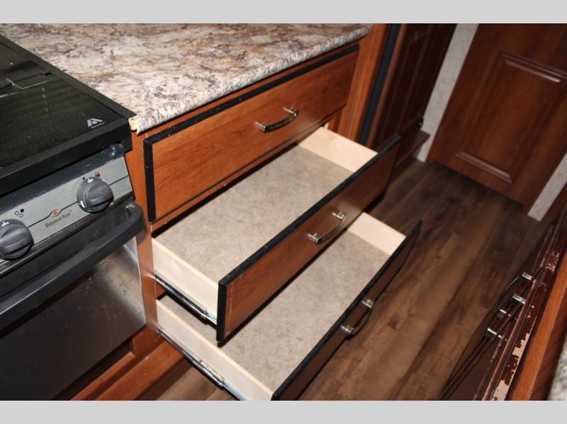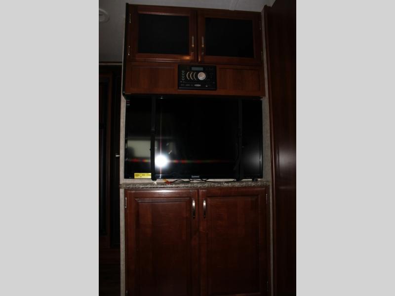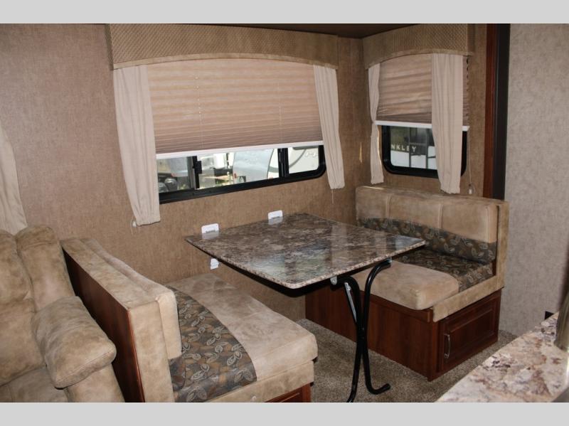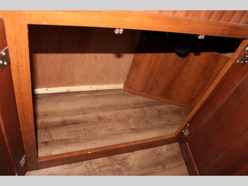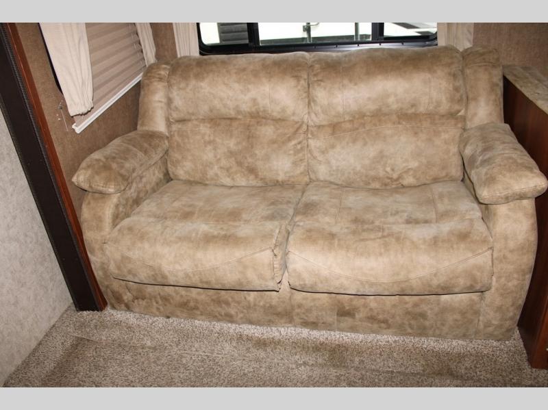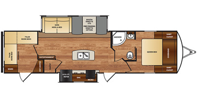 Once inside you will notice the added floor space thanks to the large slide out dinette and hide-a-bed sofa. A booth dinette is standard, or you can choose a free standing dinette with chairs. Which ever you select you will find plenty of seating for everyone. There is also a nearby entertainment center for you to view from any seating in the space.