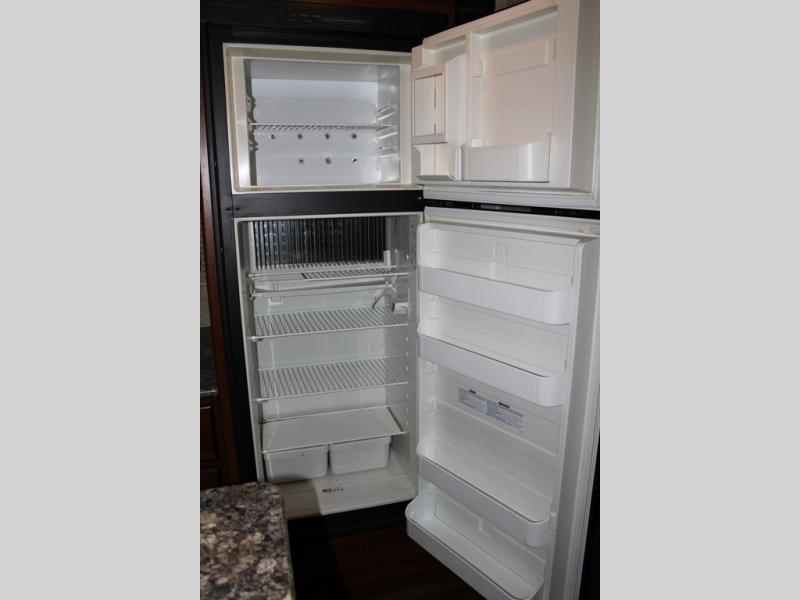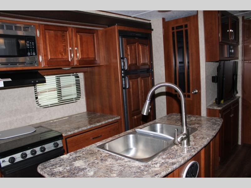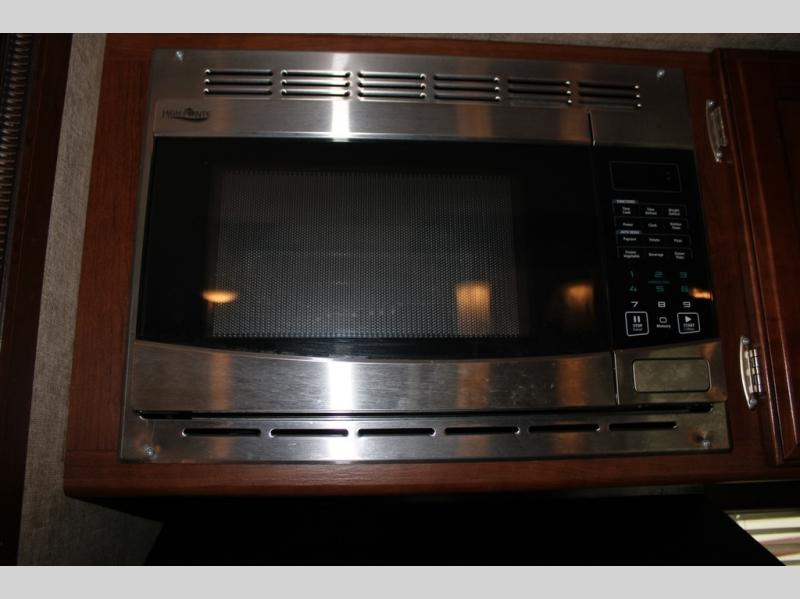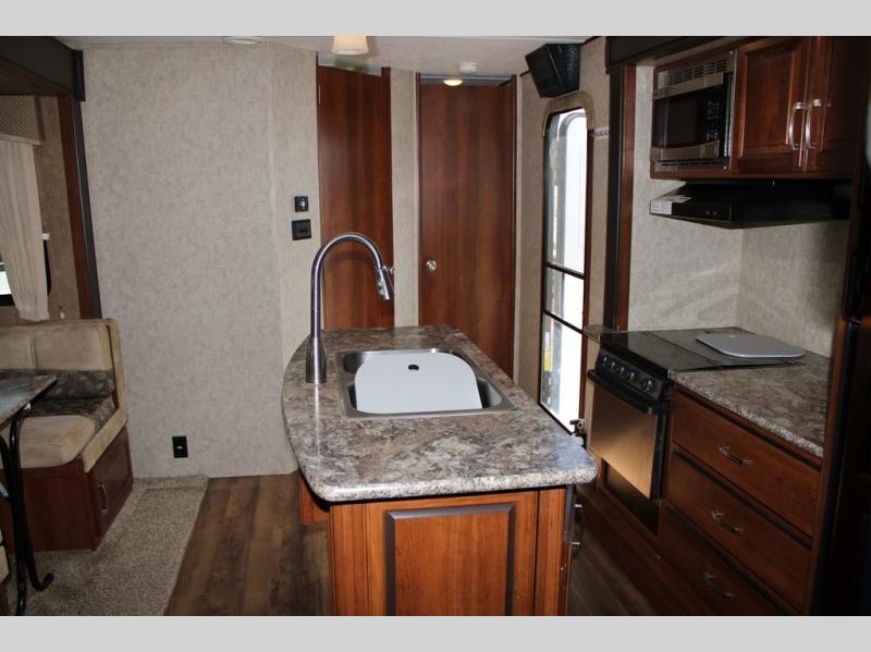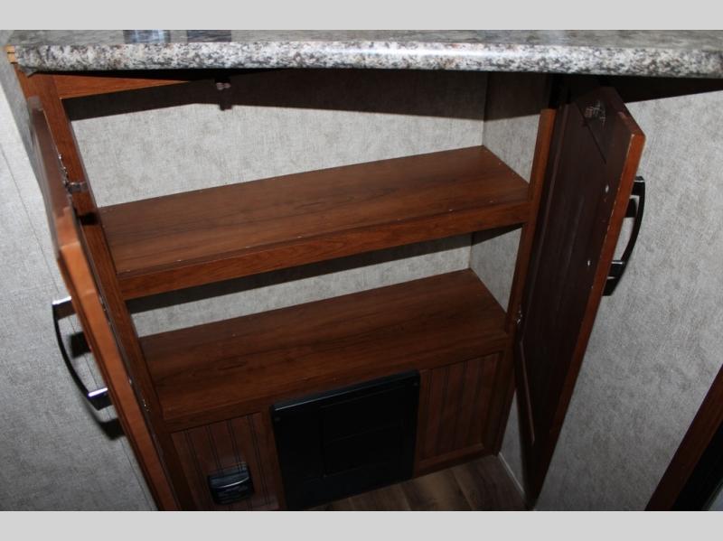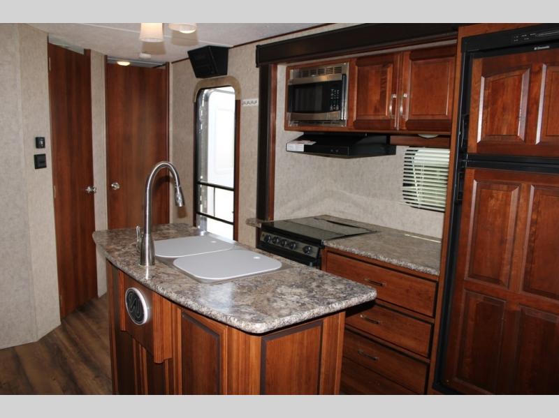 The kitchen also features a slide out that is to your immediate left inside the door closest to the front. Enjoy cooking with the three burner range included along with an overhead microwave oven. There is a kitchen island that features a double sink, plus you will love the amount of storage for food items in the walk-in pantry adjacent to the 8 cu. ft. refrigerator that is part of the kitchen appliance slide out.