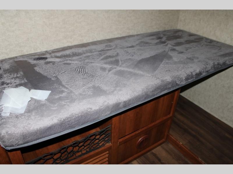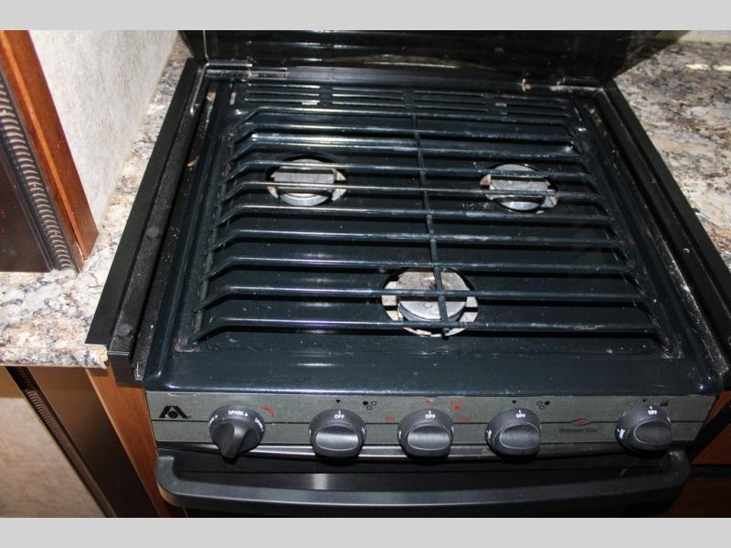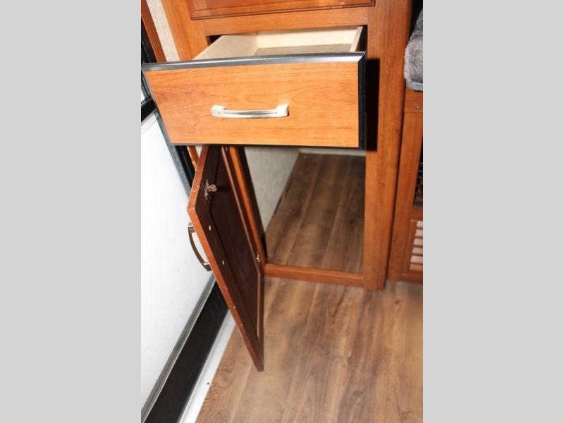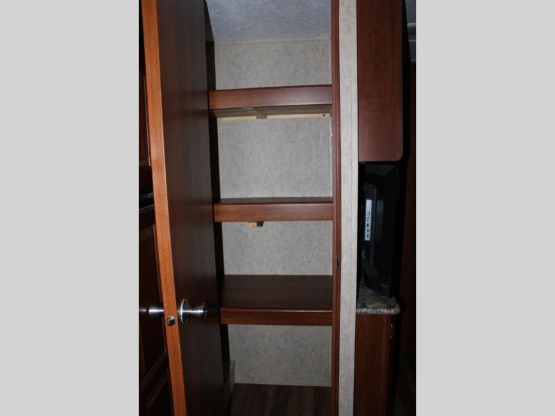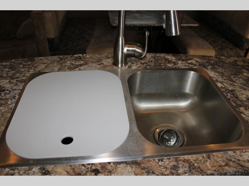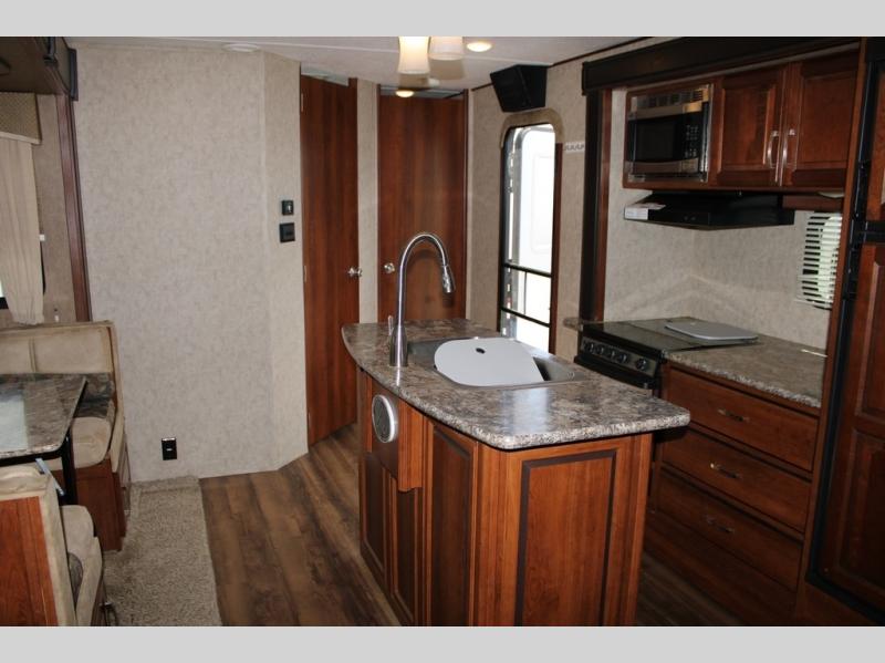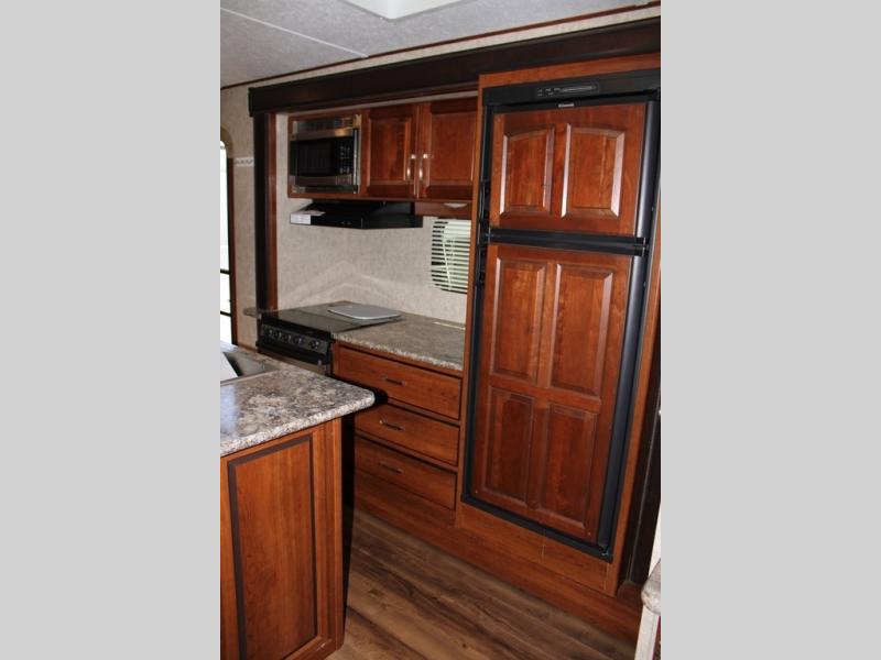 The kitchen also features a slide out that is to your immediate left inside the door closest to the front. Enjoy cooking with the three burner range included along with an overhead microwave oven. There is a kitchen island that features a double sink, plus you will love the amount of storage for food items in the walk-in pantry adjacent to the 8 cu. ft. refrigerator that is part of the kitchen appliance slide out.
