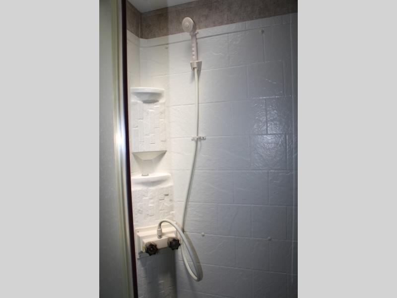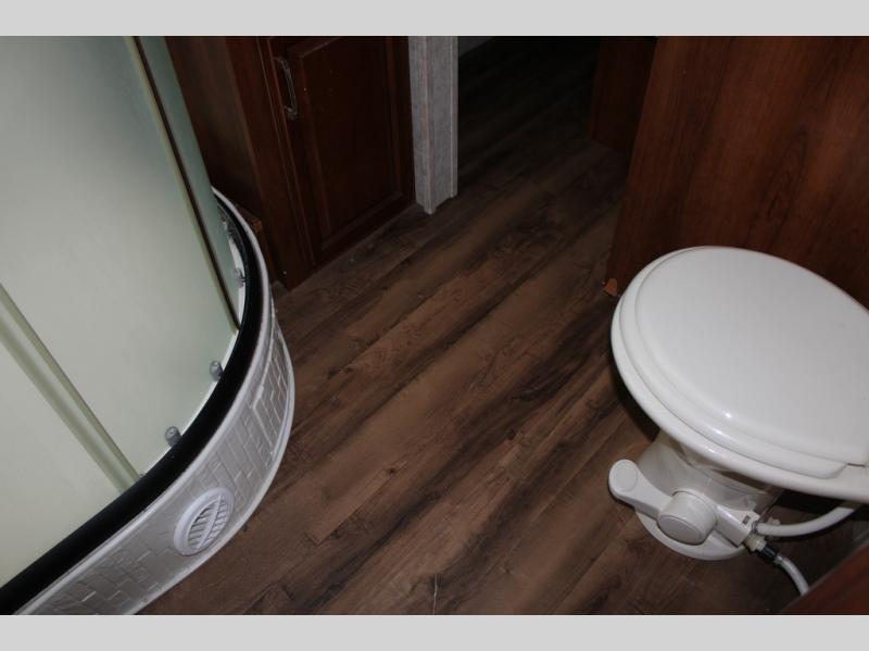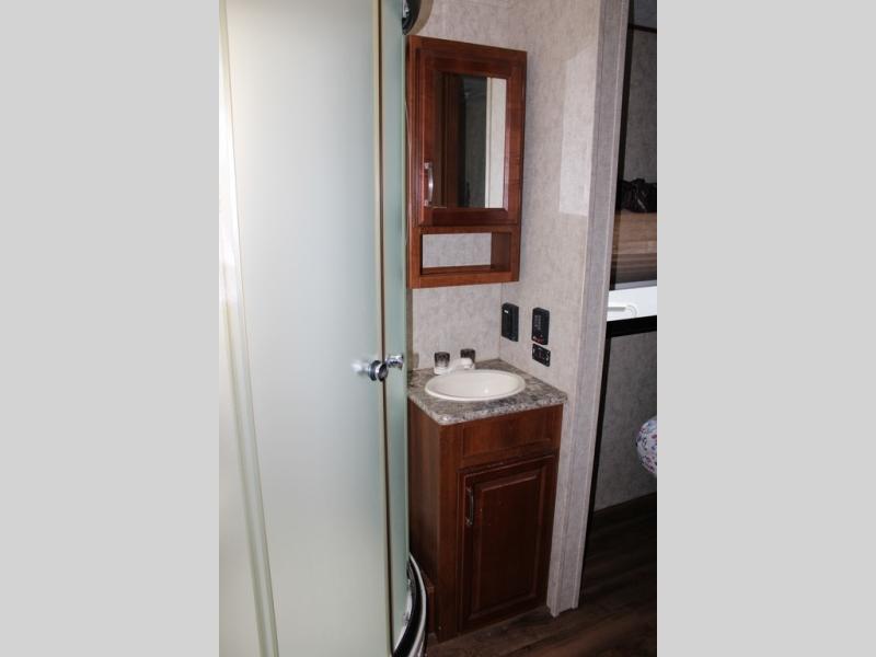 Up front to the right of the main entry door notice the convenient location of the on board bathroom. Inside you will find a corner shower, toilet, and sink, plus a medicine cabinet. There is also a second entry door that slides open and leads into the front master suite.