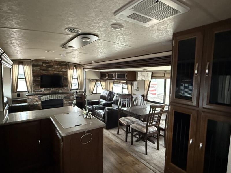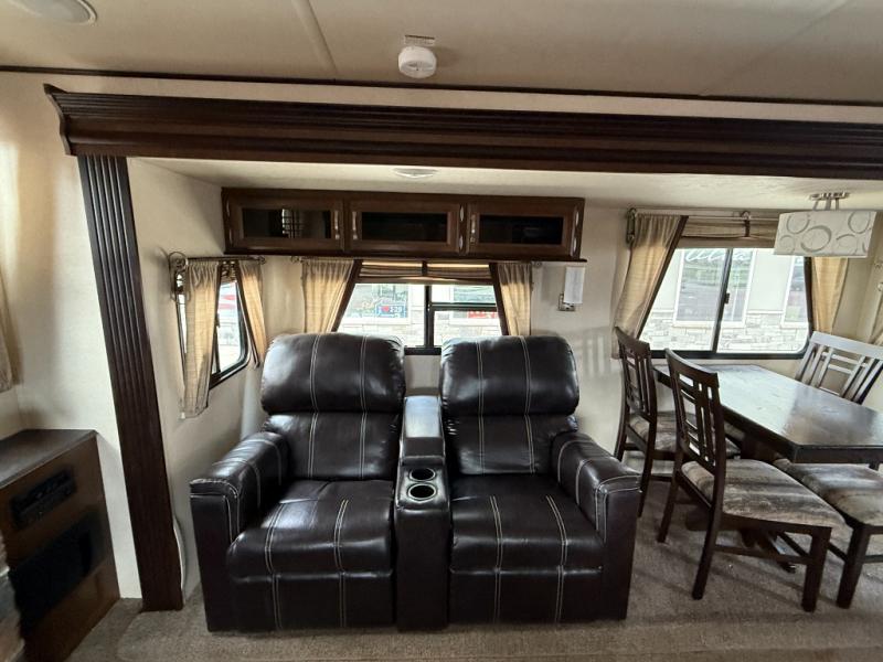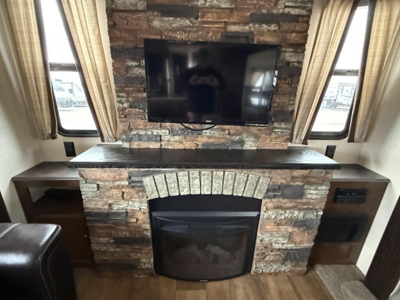 Along the road side you will find a second slide out that includes a jumbo dinette and theater seating for two. This is adjacent to the rear full wall entertainment center with fireplace, and storage. You can easily gather here with family and friends thanks to all of the seating provided.