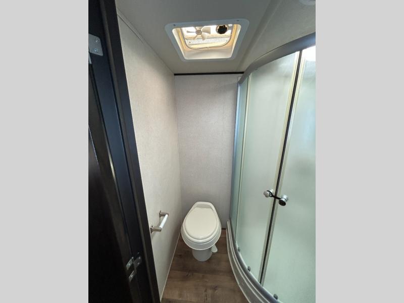 The single slide out booth dinette allows for dining, or sleeping if extra space is needed. On the opposite side you will find a tri-fold sofa with overhead storage and a pantry for your dry goods. An entertainment center is on the outer bathroom wall for easy viewing in this combined area.