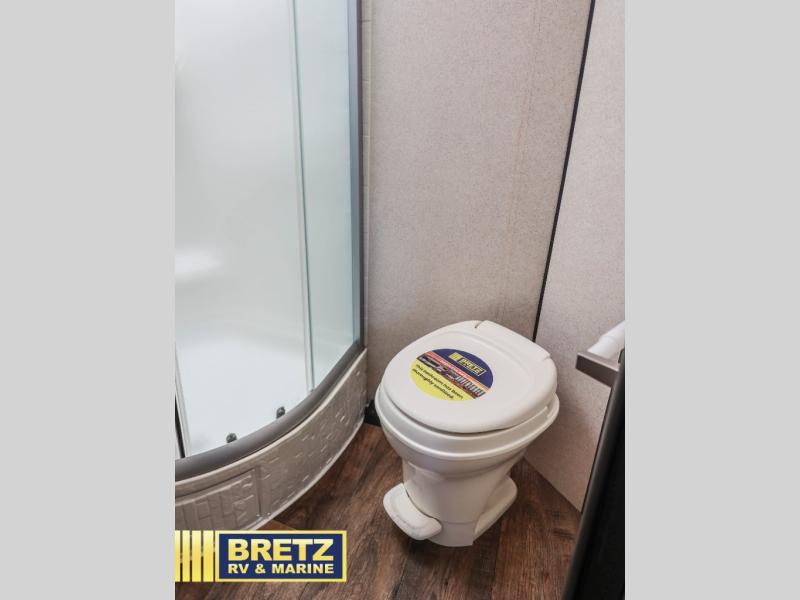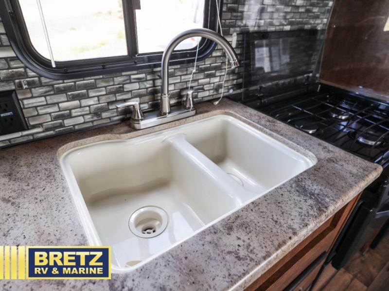 Cook up meals and snacks for your hungry crew in this Wildwood X-Lite kitchen along the road side featuring a double sink, a three burner cook-top with overhead microwave oven, and a refrigerator for all of your perishables. In the kitchen area you will have a width of 67" from the stove to the curb side wall. There are also overhead cabinets along the curb side wall just inside the main entry door for all of your gear and belongings.