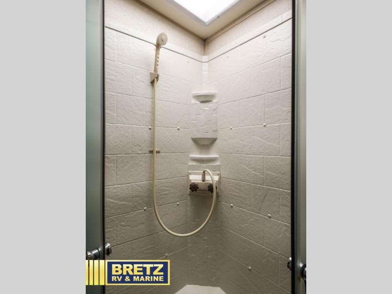 A convenient bathroom is located directly across from the entrance. Inside find a corner radius shower, a toilet, and sink.