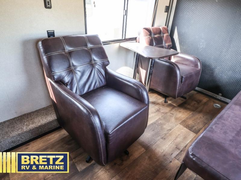 The rear 8' ramp door will make loading and unloading a breeze. Here, just inside the door, you will find an electric lift bed with dual sofas beneath. A great place to enjoy your meals, a game or two of cards, or just chillin when you take a break from your outdoor fun. At night you can easily create sleeping space for four.
