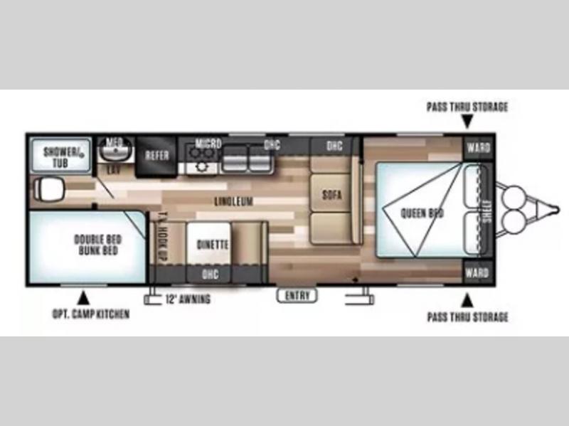 You will also be amazed at all of the interior storage as well as the exterior pass thru storage where you can stow all of your extra camping gear. The optional camp kitchen allows you to spend more time outdoors while fixing your meals. With the 12' awning you can sit and visit with friends just a little bit longer, while staying protected from the sun, and more!