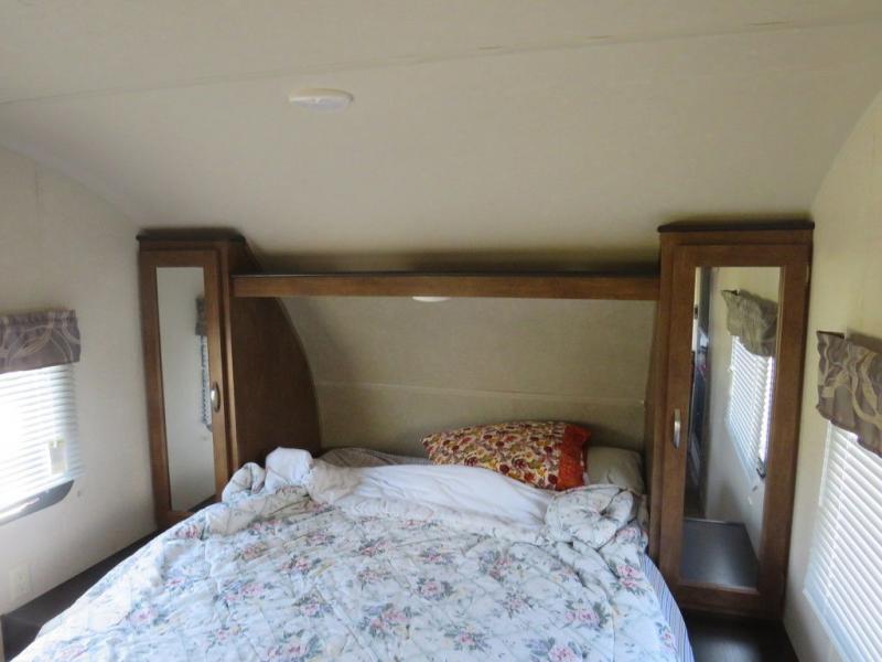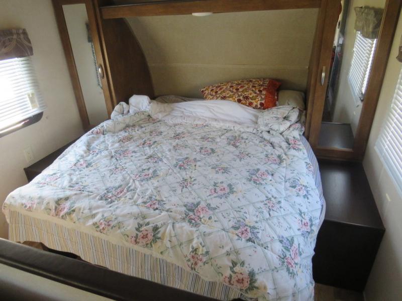 Proceeding toward the front of the travel trailer, you will come to the front bedroom. Enjoy a good night's rest on the comfortable queen bed. You can store your clothes in the wardrobes.