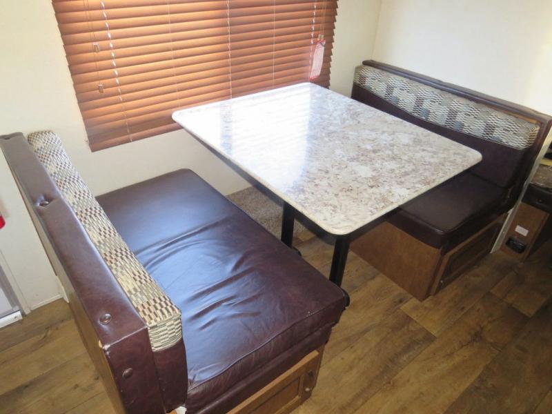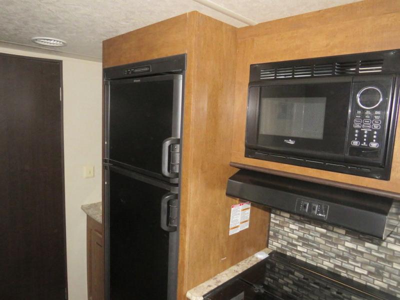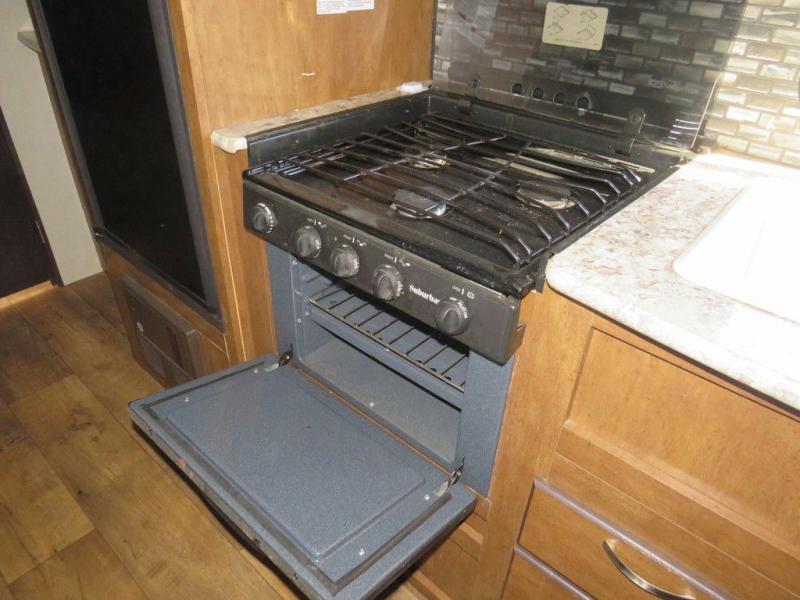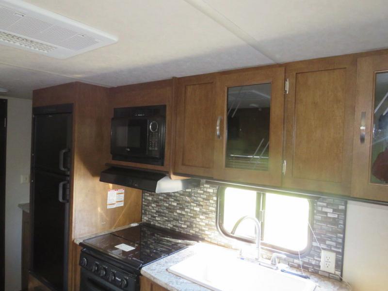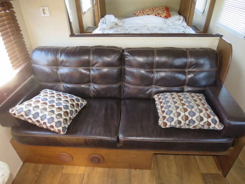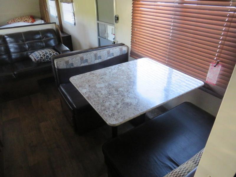Entering the travel trailer, and find to the left that there is a dinette with TV hook-up above. Enjoy your meals at the dinette, and at night you can convert this area into additional sleeping space. The opposite side of the travel trailer has a double kitchen sink, three burner range, microwave, and refrigerator. Straight in from the entry door is a comfortable sofa.