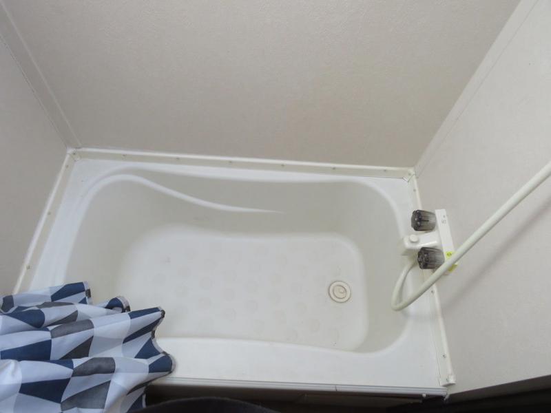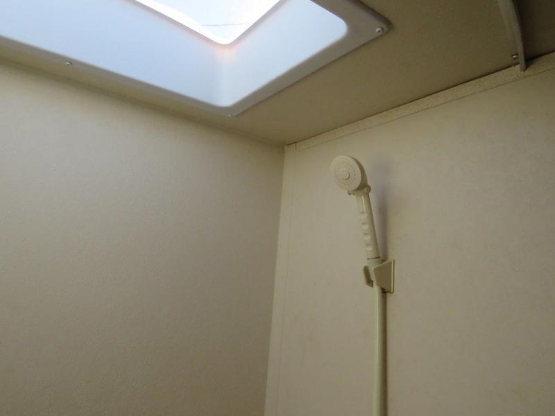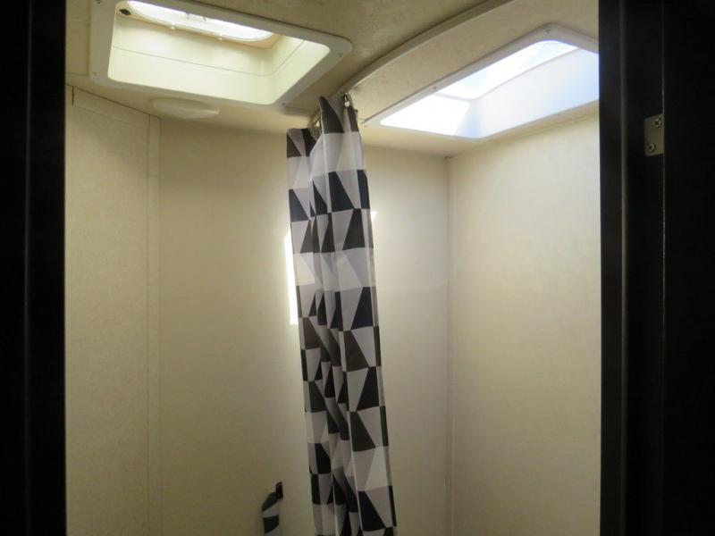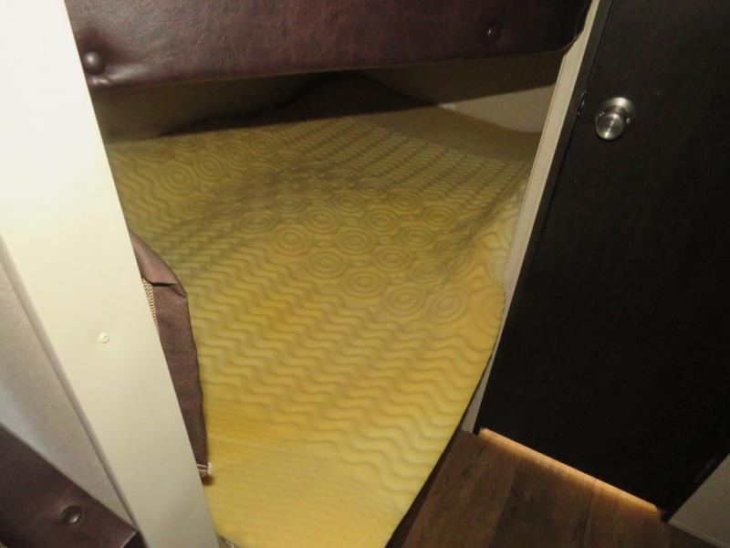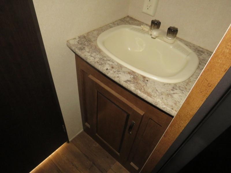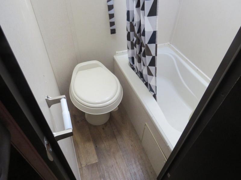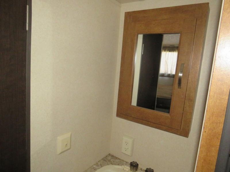 Along the opposite side of the bunks is where you will find the bathroom. In the bathroom area there is a toilet and a shower/tub. Just outside of the bathroom there is a sink and medicine cabinet.