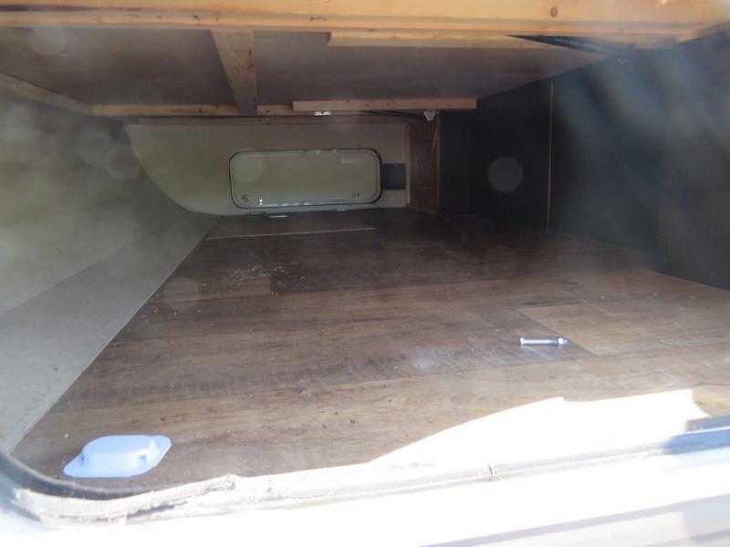 The rear left corner of the trailer has a double bed with a single bed above and a wardrobe.