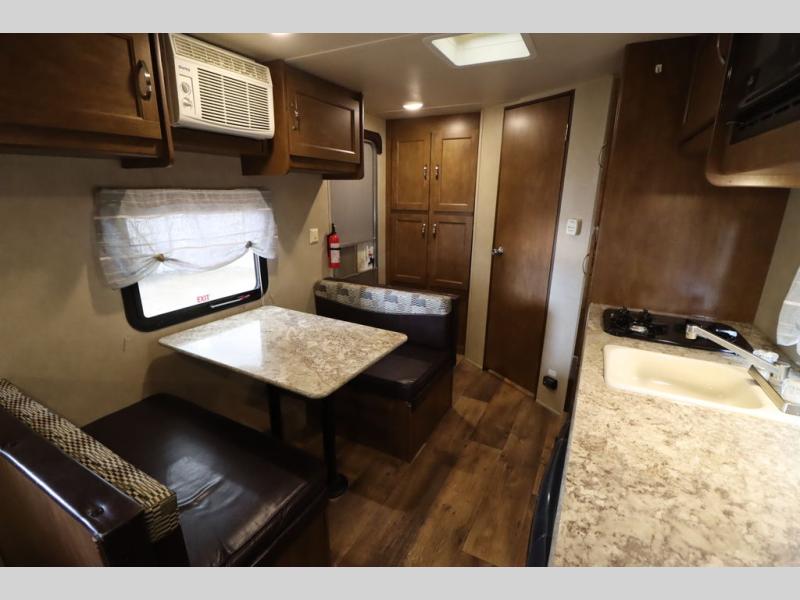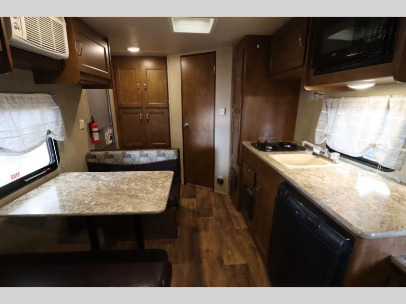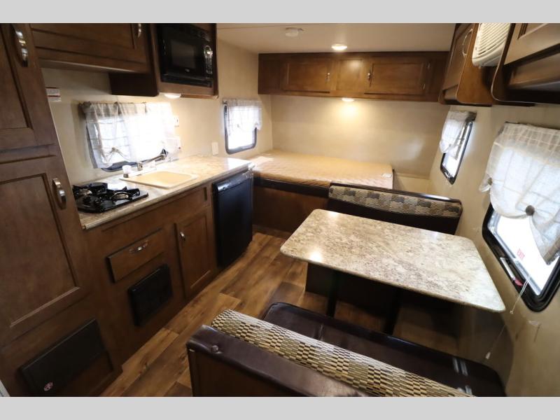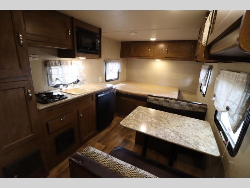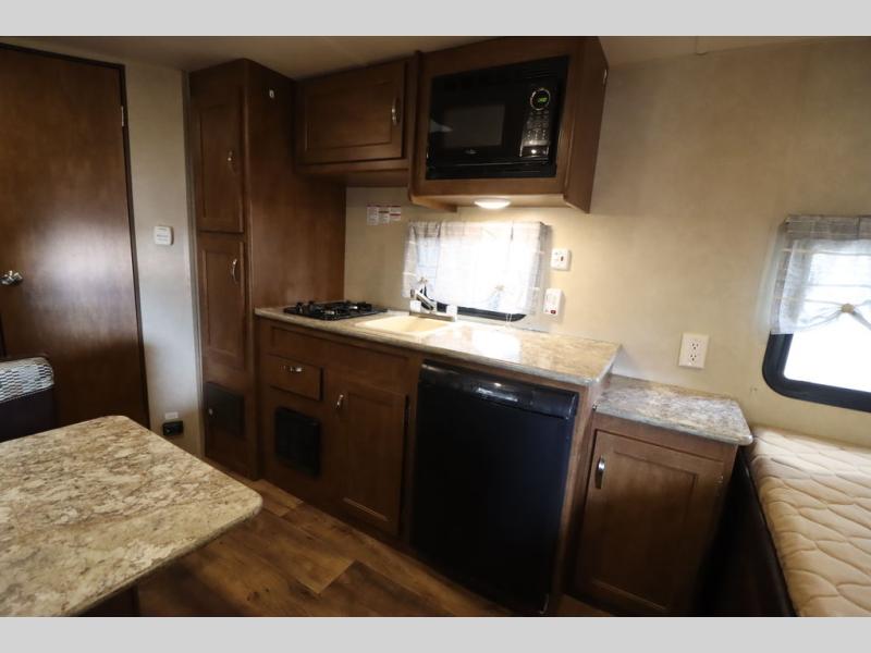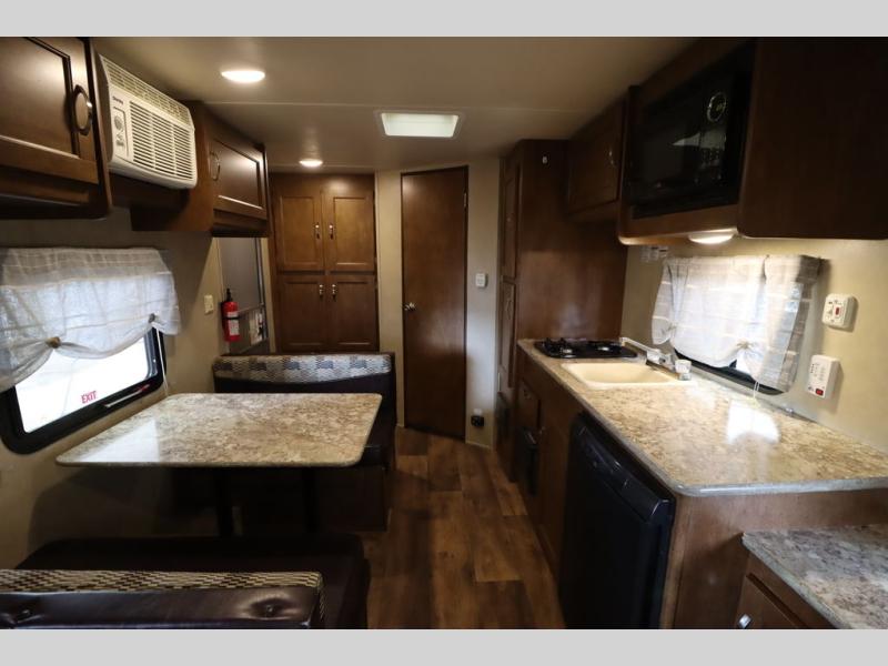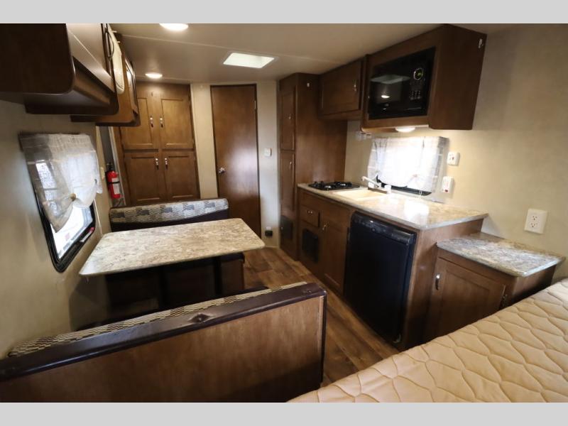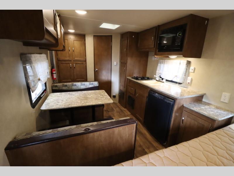 As you enter the travel trailer, to the left there is a wardrobe. To the right of the entrance you will find a dinette. Across from the dinette there is a pantry, two burner range, sink, microwave, and refrigerator.