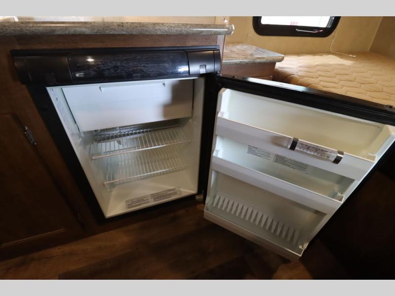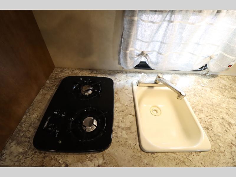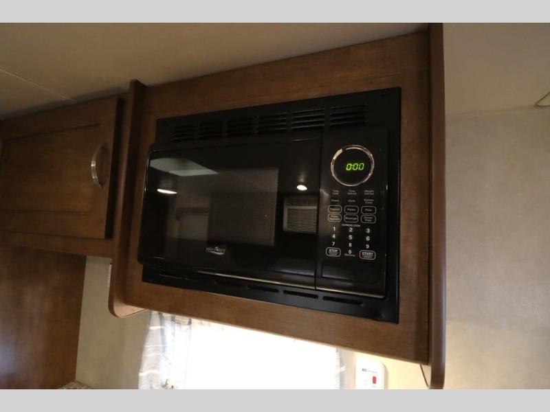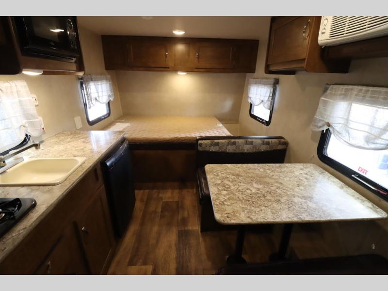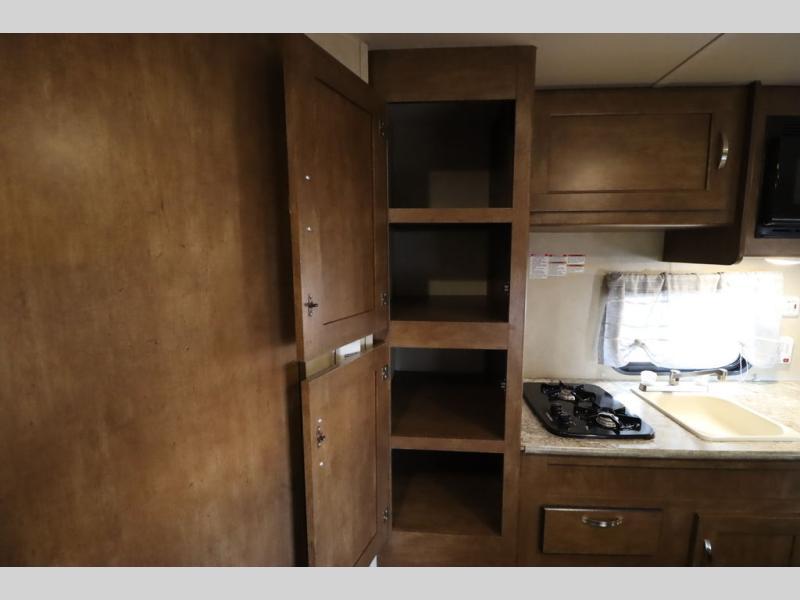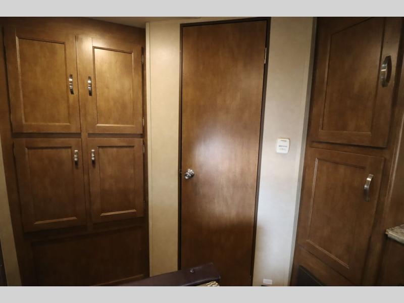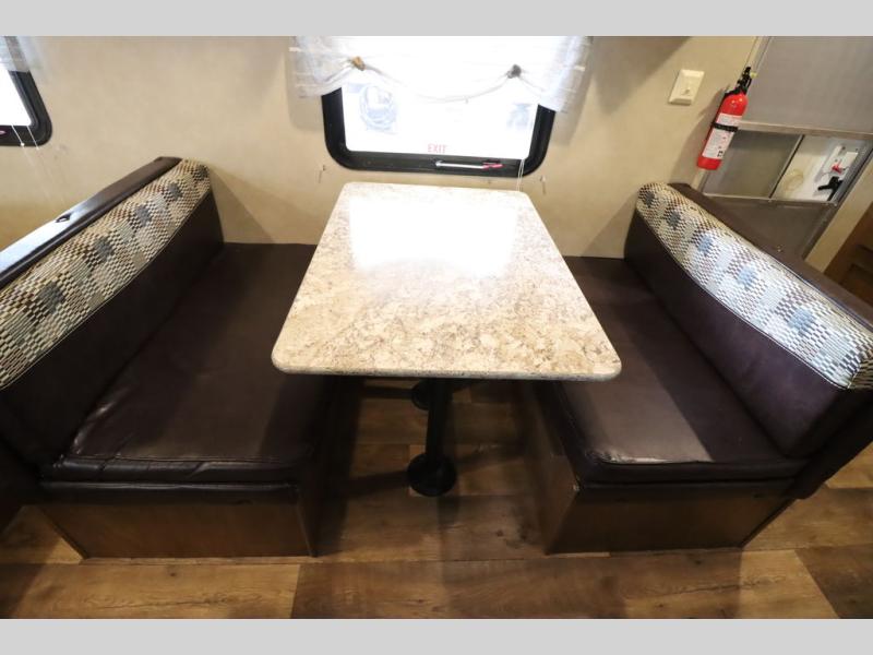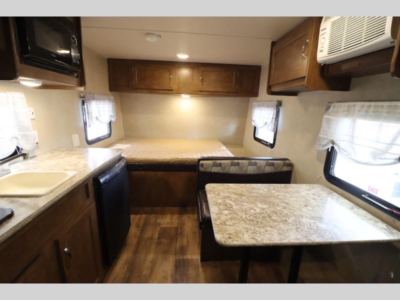 As you enter the travel trailer, to the left there is a wardrobe. To the right of the entrance you will find a dinette. Across from the dinette there is a pantry, two burner range, sink, microwave, and refrigerator.