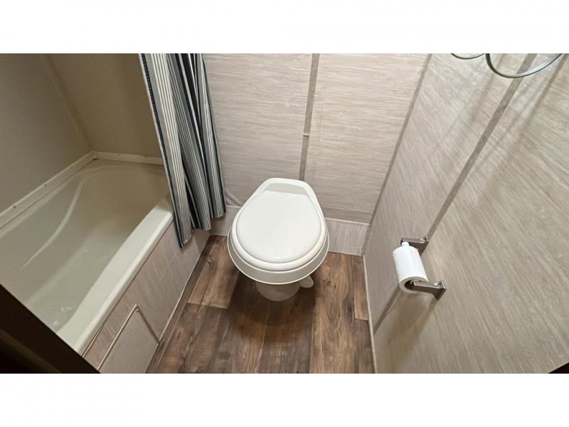 The bathroom is across from the bunks making it convenient especially at night. The bath features a toilet and a shower.