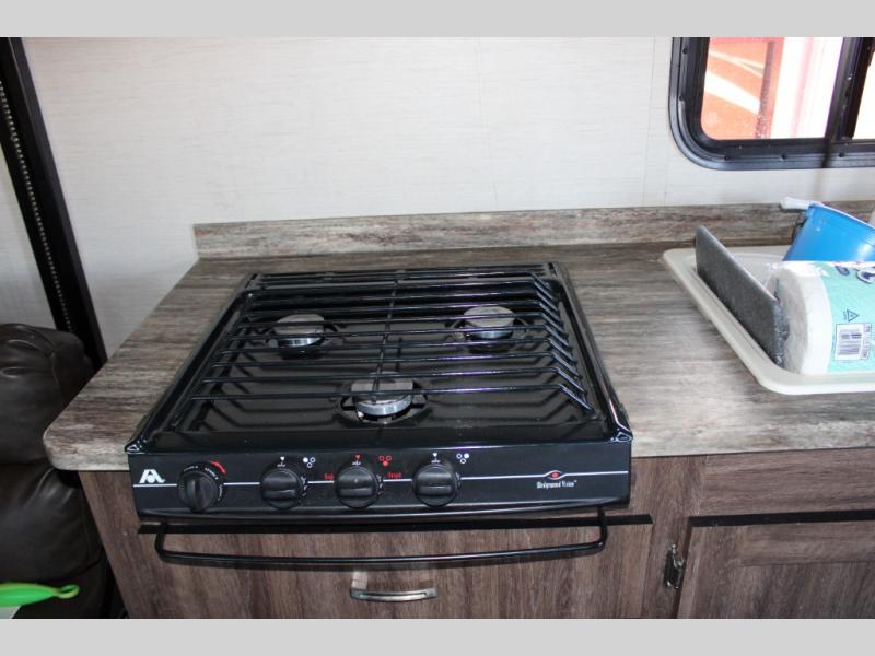 The kitchen area has a refrigerator, double sink, three burner range, overhead cabinets, and to the left of the entry door there is a large overhead cabinet, and so much more!