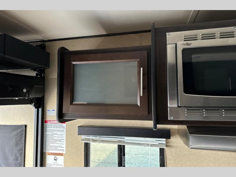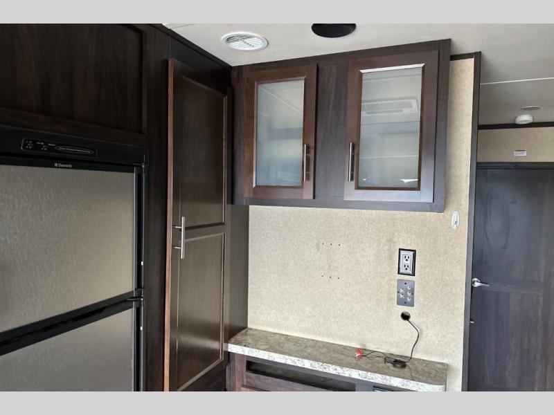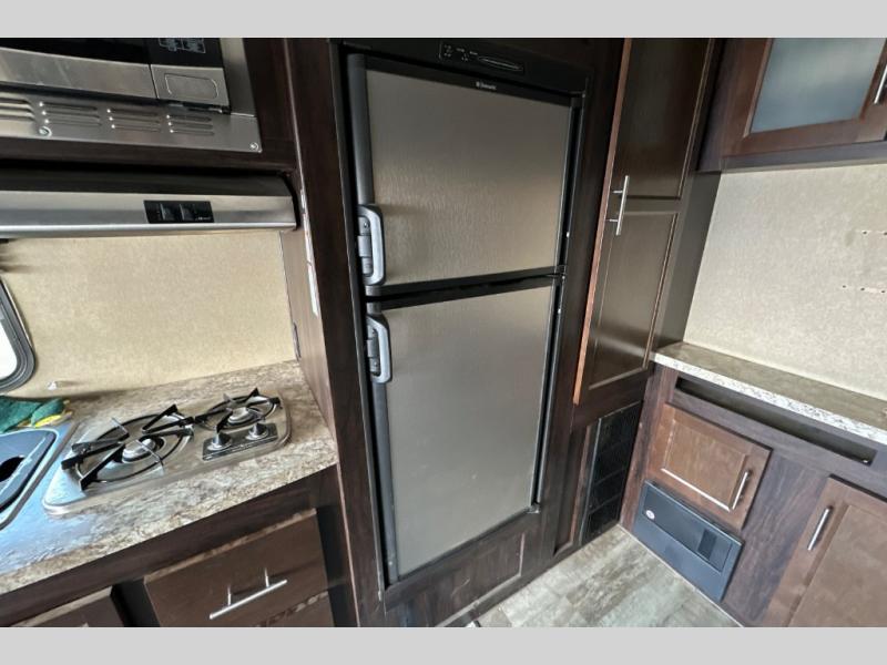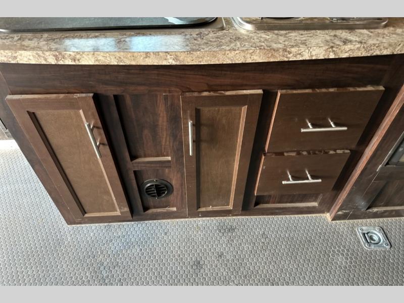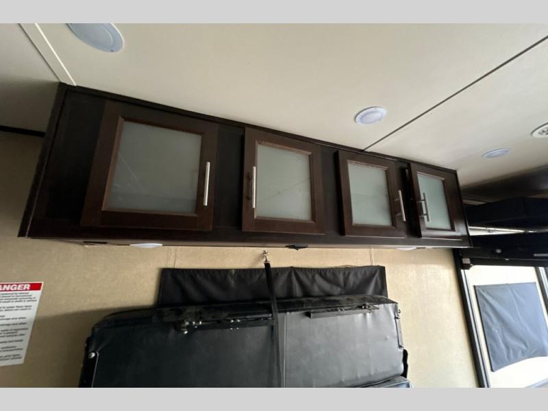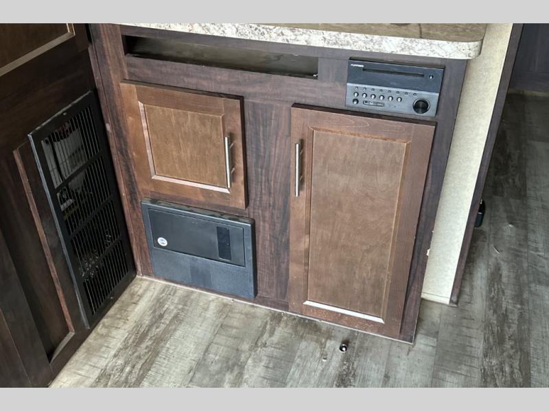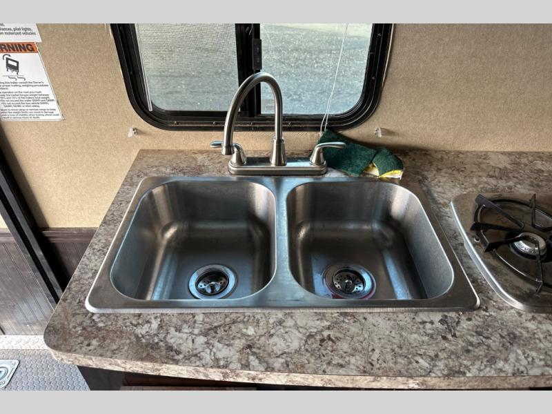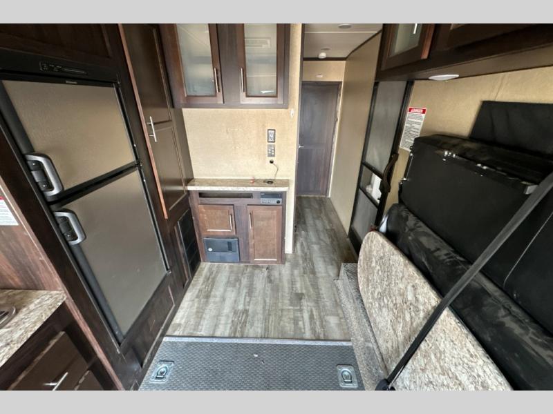 Stepping through the entry door, you will find the kitchen area to your left. Along the road side there is a double kitchen sink, double burner range, overhead microwave, refrigerator, and large pantry. Enjoy watching TV or movies at the entertainment center. Along the door side of the trailer there is a rollover sofa with an overhead cabinet.