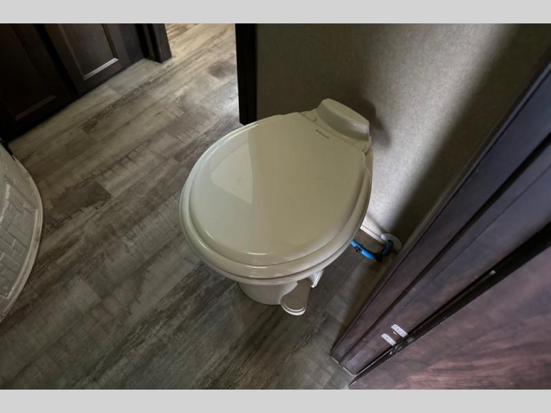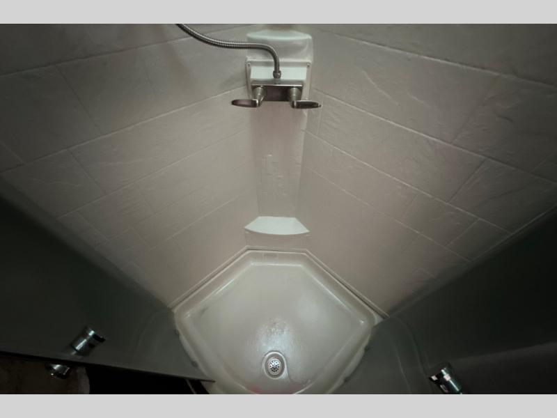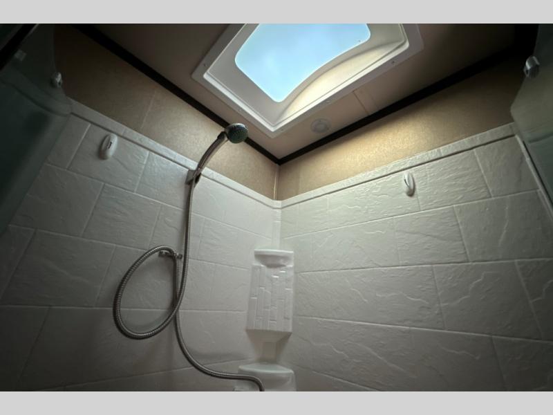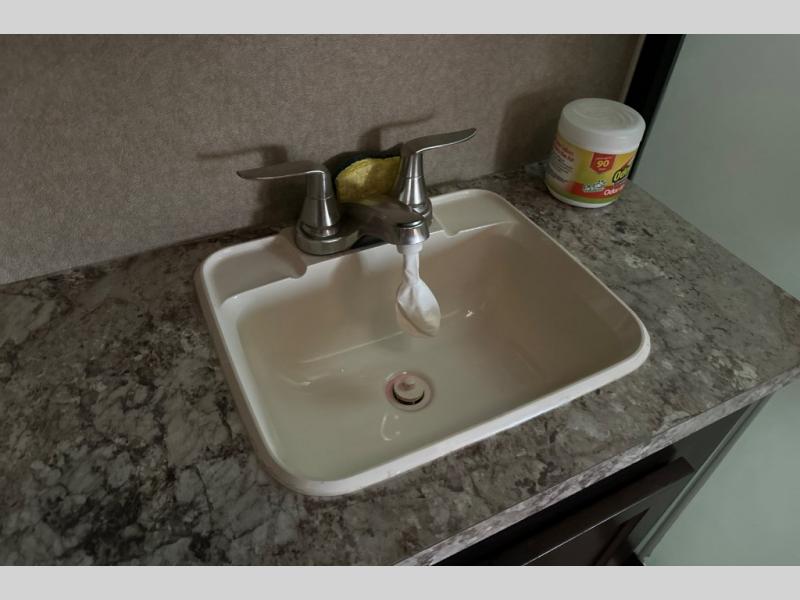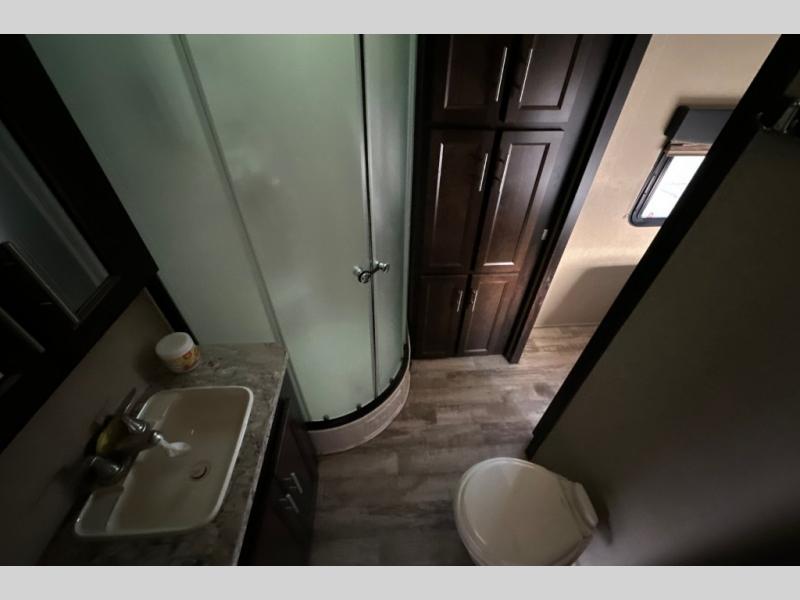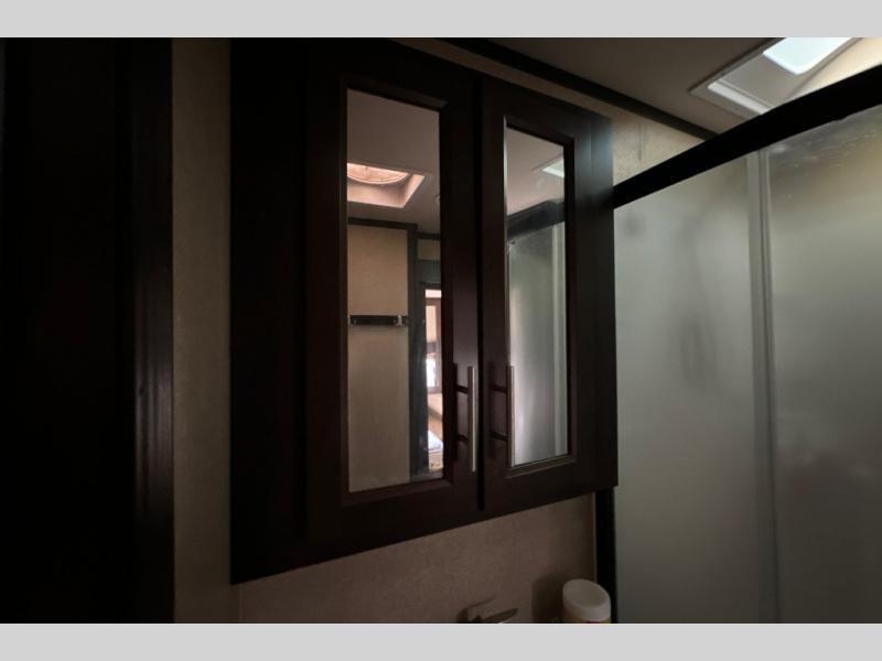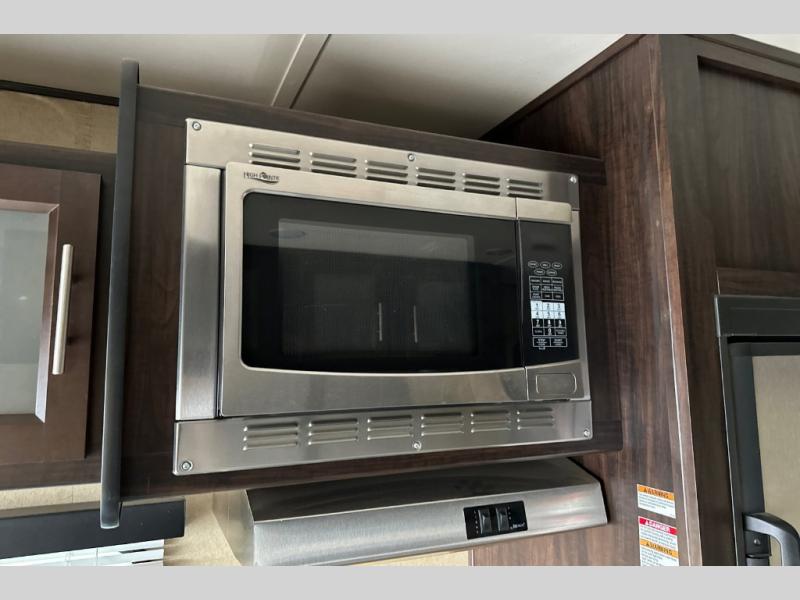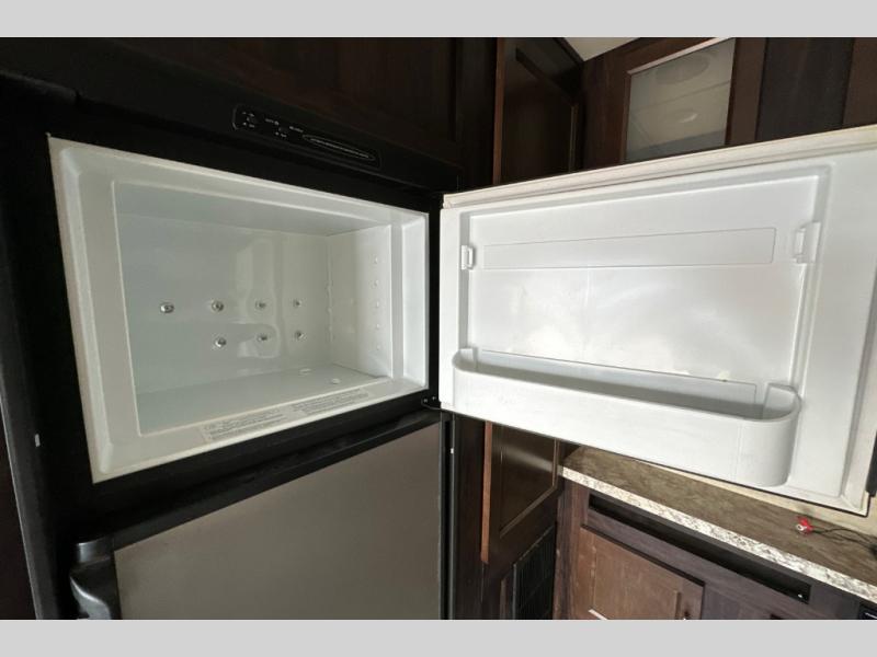 Stepping through the entry door, you will find the kitchen area to your left. Along the road side there is a double kitchen sink, double burner range, overhead microwave, refrigerator, and large pantry. Enjoy watching TV or movies at the entertainment center. Along the door side of the trailer there is a rollover sofa with an overhead cabinet.