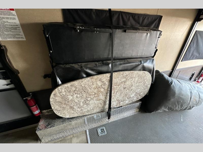 The cargo area has an optional electric bed & pass through dinette which provide extra sleeping space and night, and more seating space at the dinette during the day. The spring assist ramp door allows for easy loading and unloading of your gear once you get to your destination, plus more!