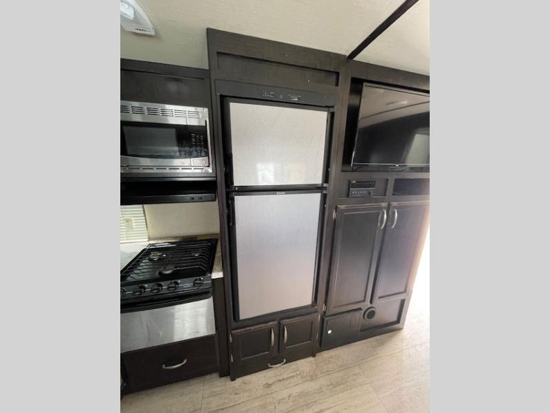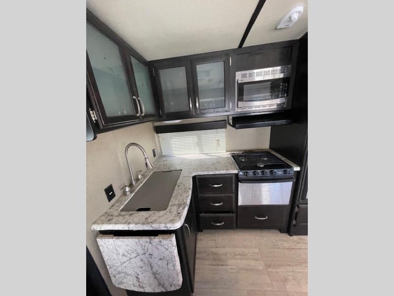 Along the curb side wall, next to the entry door there is a handy shoe storage space, a wardrobe and pantry, plus a refrigerator that includes a pet dish beneath for easy access. You will also find a three burner range with overhead microwave oven, countertop space for making meals and snacks, and a large sink for cleaning the dishes along the interior wall.