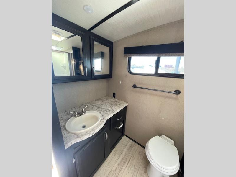 Step inside model 2600RB and find a rear bath to your immediate left. Here you will find a 30" x 36" shower with skylight, linen cabinet, toilet, and a vanity with sink, plus overhead storage. The bathroom features a space saving sliding door as well.