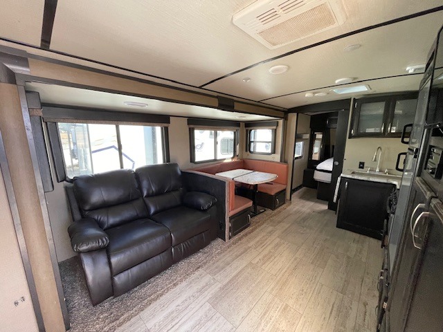 Straight in from the entry door you can enjoy a tri-fold sofa or choose theatre seating instead within a slide out along with a u-shaped dinette or choose an optional free standing table with chairs. There is also a removable ottoman for when you want to kick back and relax watching your favorite shows on the 32" LED TV on a swing arm found in the entertainment center located on the opposite side. The tri-fold sofa and the u-shaped dinette can also offer additional sleeping space for overnight guests.