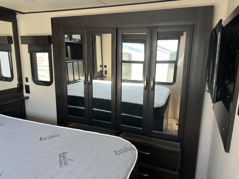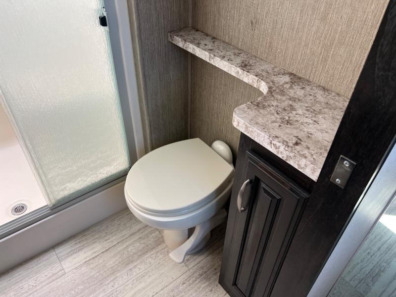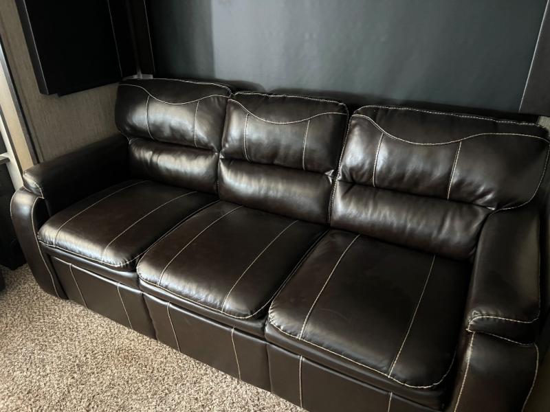 Head up the steps to the raised front living and entertainment area. There is a theater seat for two along the inside wall, or you can choose optional lounge chairs instead. Both slides in front feature a tri-fold sofa which allows for plenty of seating during daytime hours and sleeping when you entertain overnight guests. The front wall offers a telescoping TV with fireplace and overhead cabinets making this a great space to enjoy the company of your family and friends!
