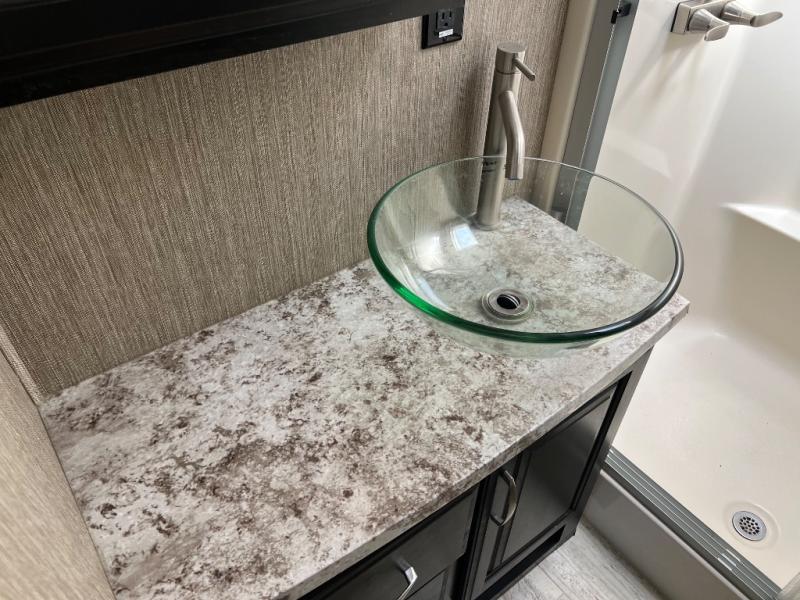A complete bath is found in the hallway between the bedroom and kitchen area. Inside there is a shower with skylight and seat, toilet, and a vanity with vessel sink plus overhead storage.