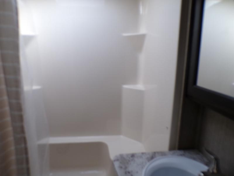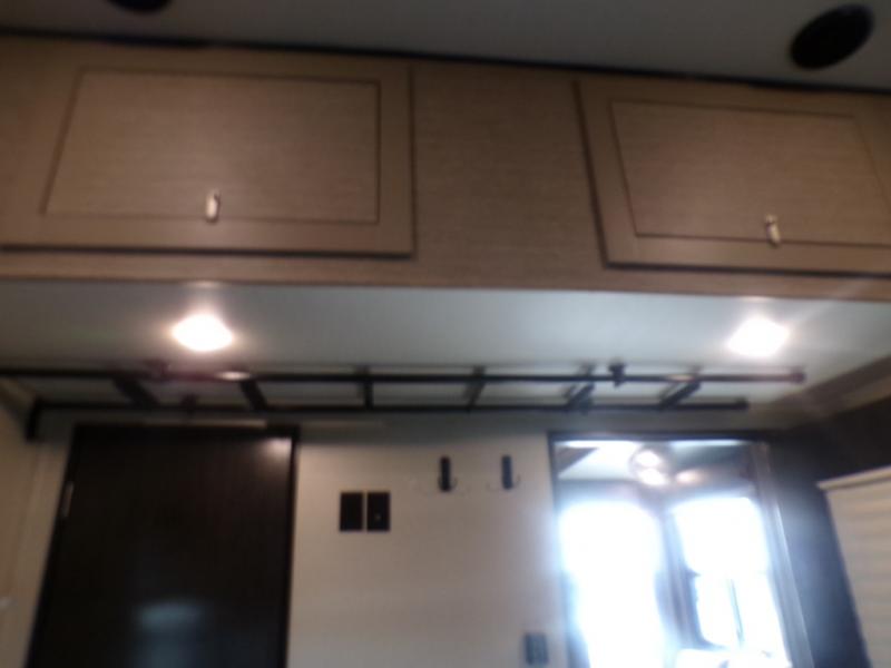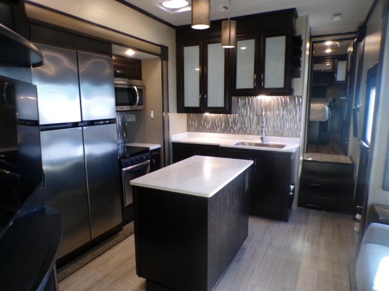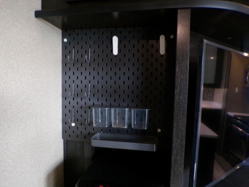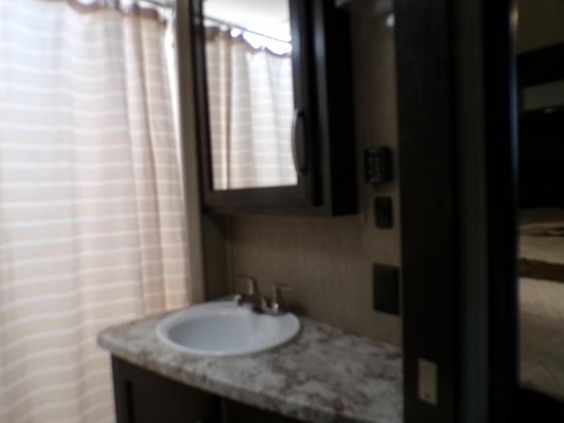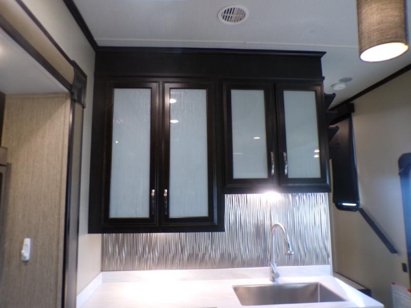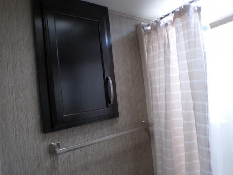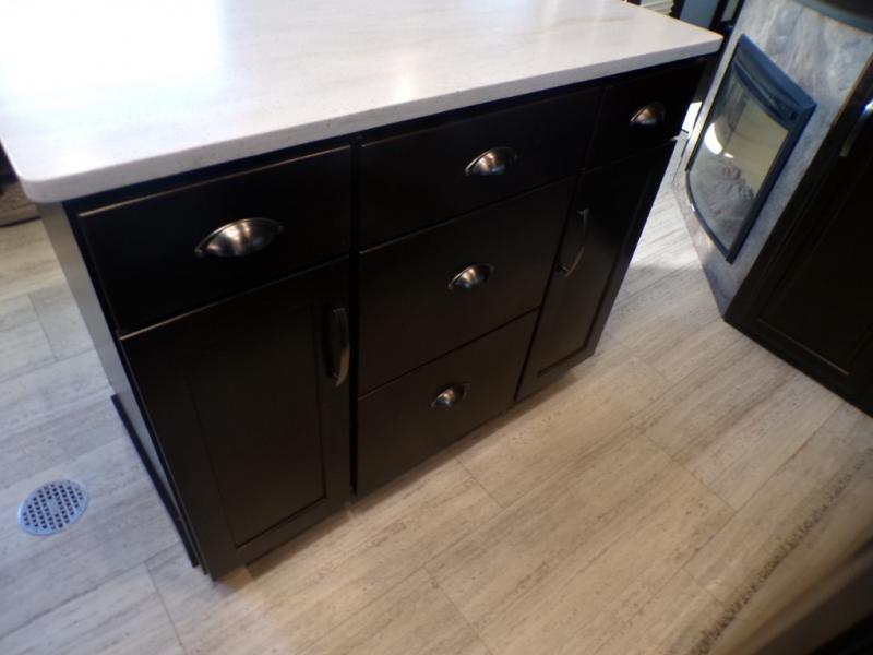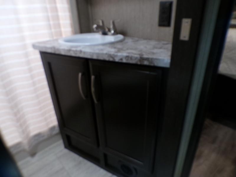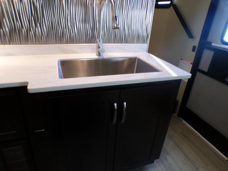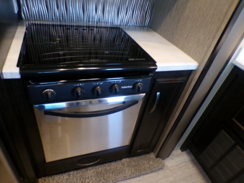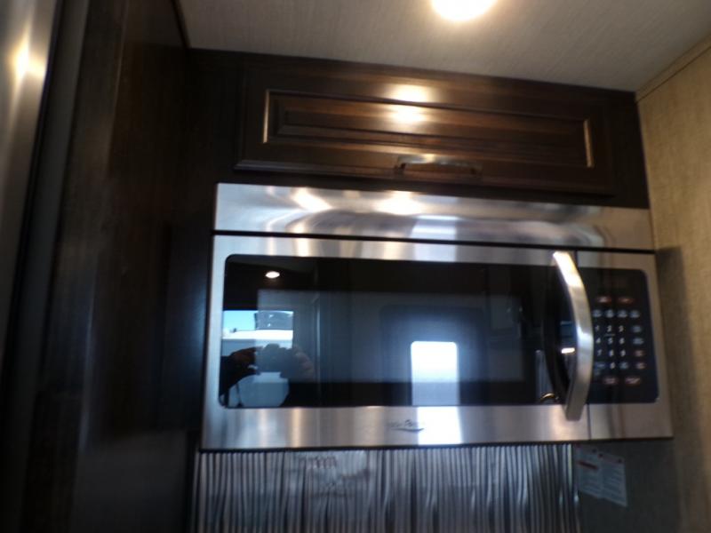 The kitchen offers all the amenities you need to enjoy spending time on the road. There is a slide out 18 cu. ft. refrigerator, three burner range with overhead microwave, and a counter peninsula along with a kitchen sink, and storage both above and below the counter.