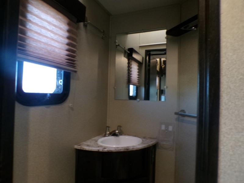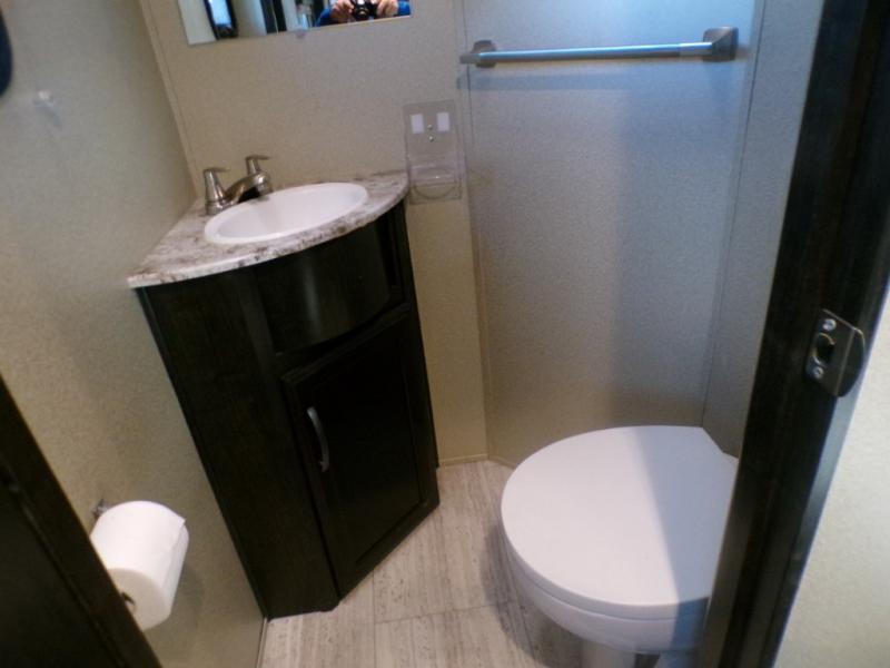 Back through the unit to the rear cargo area first notice the single loft above along the front of the garage. There is a half bath featuring a toilet and sink for added convenience when you come in from a fun filled day.