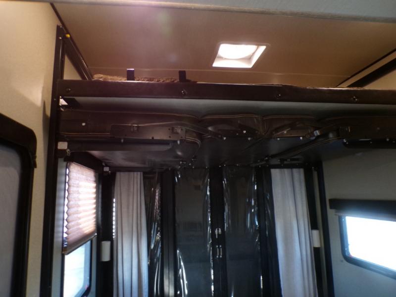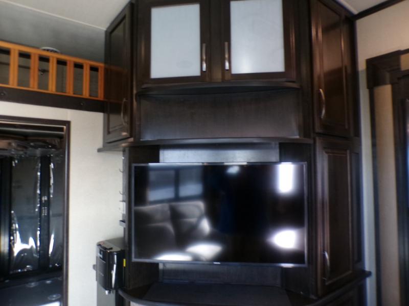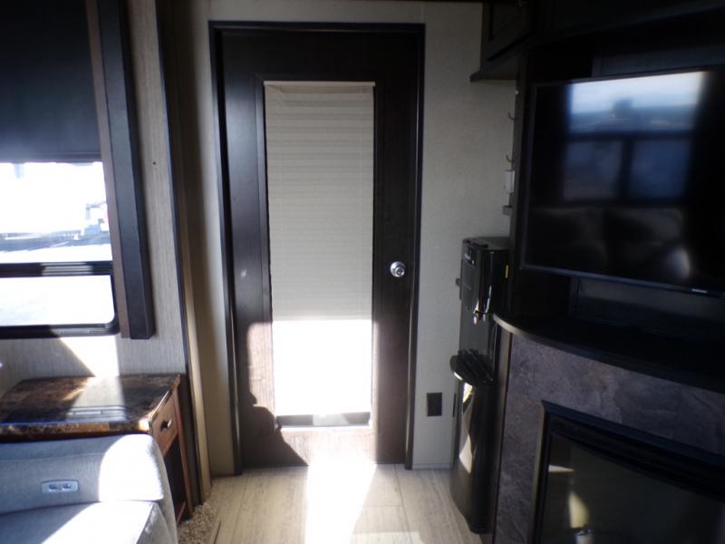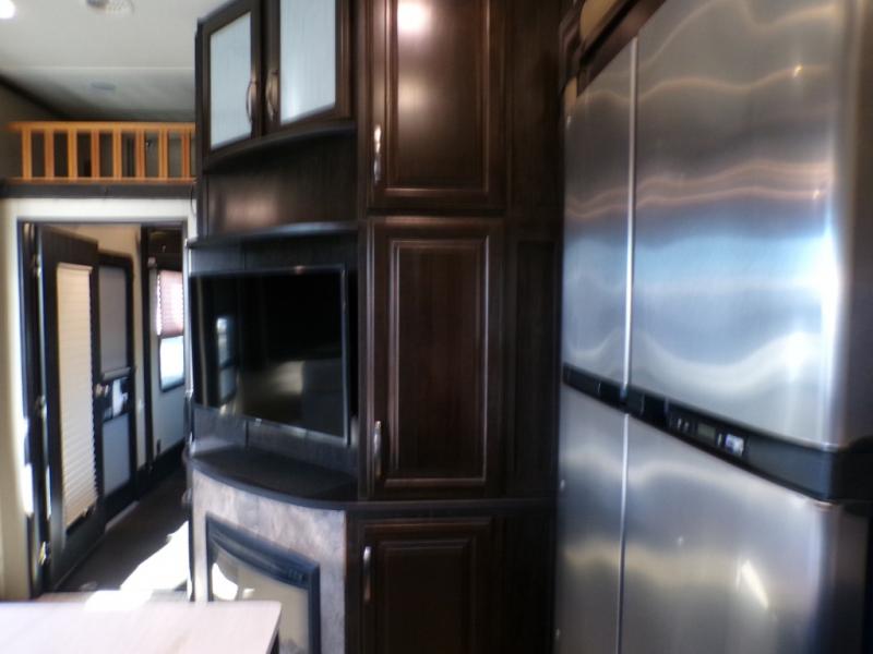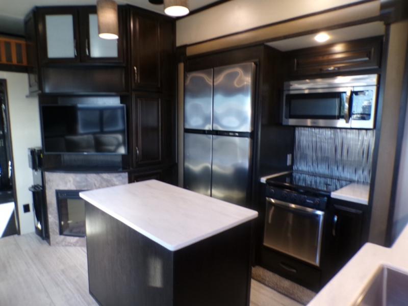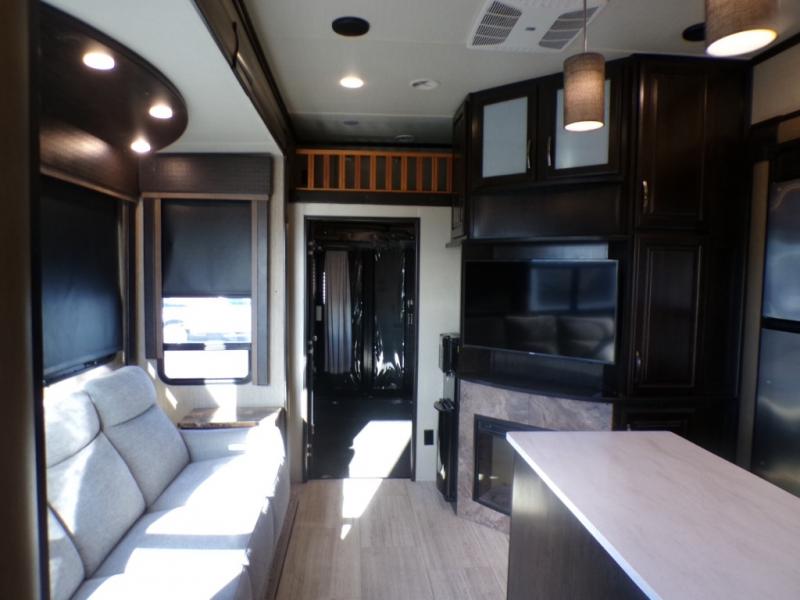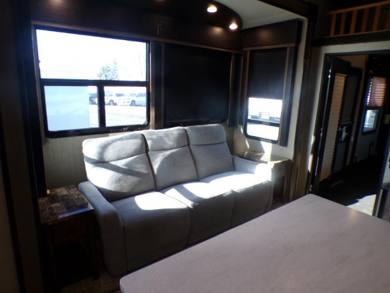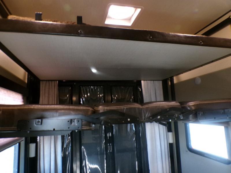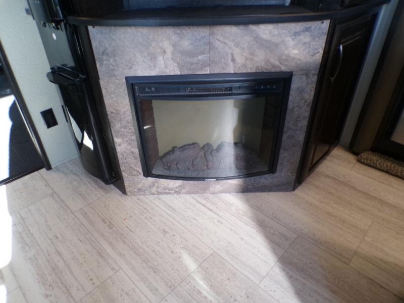 Step inside the main entry door and notice all the home like features with an entertainment center including a LED TV with fireplace below. There is also a pantry/linen straight ahead, a large slide out 4-seat sofa to the left of the main entry door with a stowable table for comfortable seating during mealtimes and more. You can even choose the option with sofa recliners and a dinette, or smaller sofa with dinette in place of the 4-seat sofa if you like.
