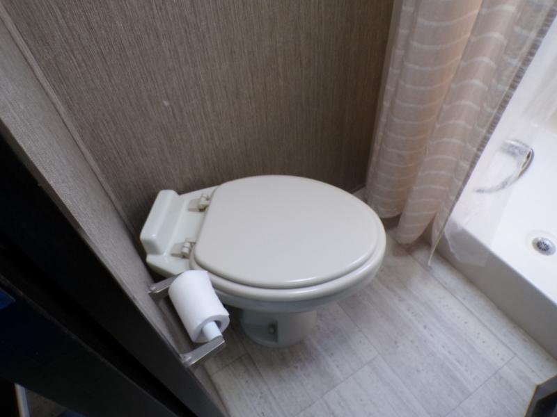 Head up the steps to the right of the entry door and find a side aisle bath including a toilet, vanity with sink, plus a shower with seat and skylight.