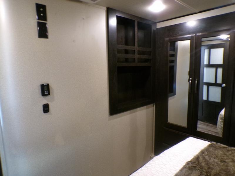 The door at the head of the hall leads into the front bedroom which features a queen size bed or choose a king, nightstands, overhead storage, and a slide out wardrobe with dual drawers.