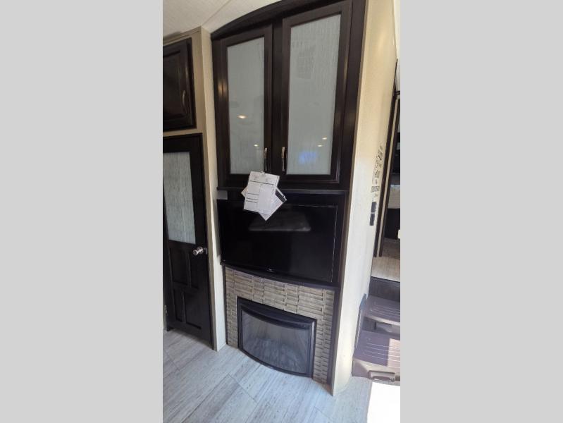 Enter the main living area through a sliding door, or through the main side entrance. Once inside you will find a large slide out 4-seat sofa with stowable table along the curb side. You can choose a 4-seat sofa recliners/dinette option, or an optional smaller sofa recliner with a smaller dinette as well. There is an entertainment center along the angled bath wall featuring a LED TV with fireplace below. A nice pantry is also along the same wall and provides a lot of storage for canned and dry goods.