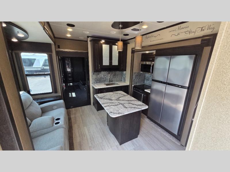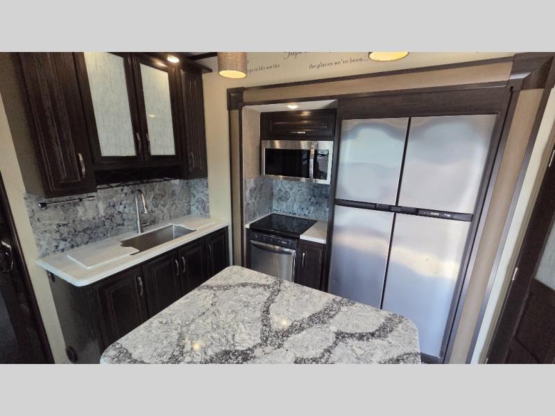 You can easily cook up meals and snacks to keep everyone fueled all weekend long with an 18 cu. ft. refrigerator for your cold stuff, and a three burner range with overhead microwave oven inside a slide out. There is a counter area with large sink along the interior wall which offers added overhead cabinet space, plus more. There is also a handy kitchen island for food prep and serving space too.