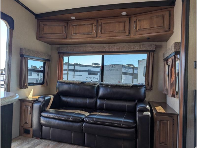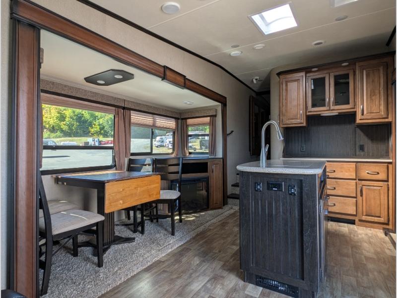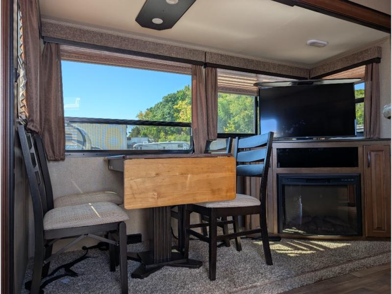 Step inside to the spaciousness with dual opposing slide outs on either side of the unit. To your left is the rear wall with theatre seating and end tables, or optional tri-fold sofa. The first slide features a free standing dinette along with a 40" telescoping LED TV, entertainment center and fireplace.