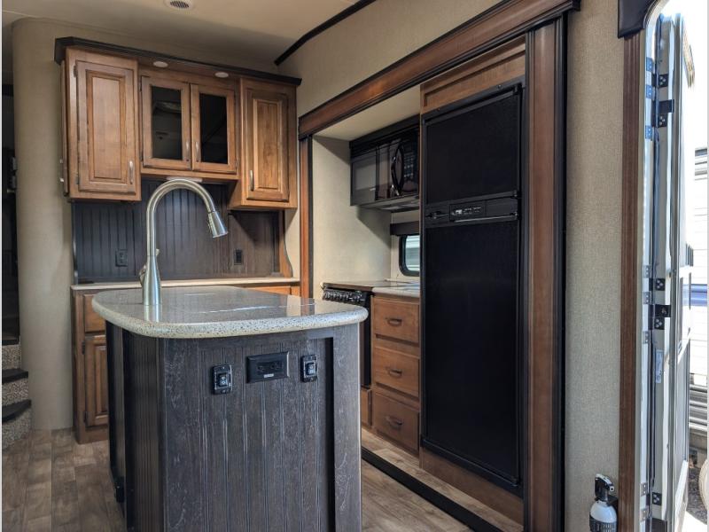 The second slide out along the curb side wall includes a refrigerator, and three burner range with convection microwave plus overhead storage for your dishes and things. Along the interior wall find a countertop for preparing or serving meals with additional overhead storage, plus lower cupboards and drawer space. A much desired kitchen island includes a large single sink, extra counter space and storage.