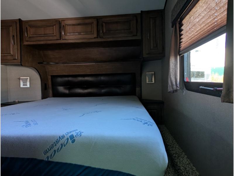 Head up the steps towards the front of the fifth wheel to a side aisle bath on your right. The bathroom includes a radius shower including a skylight, toilet, and a vanity with sink. The bath also features a second entry door that slides open to allow access into the master bedroom. There is also access to a linen cabinet with drawer in the hallway within the bedroom slide out.