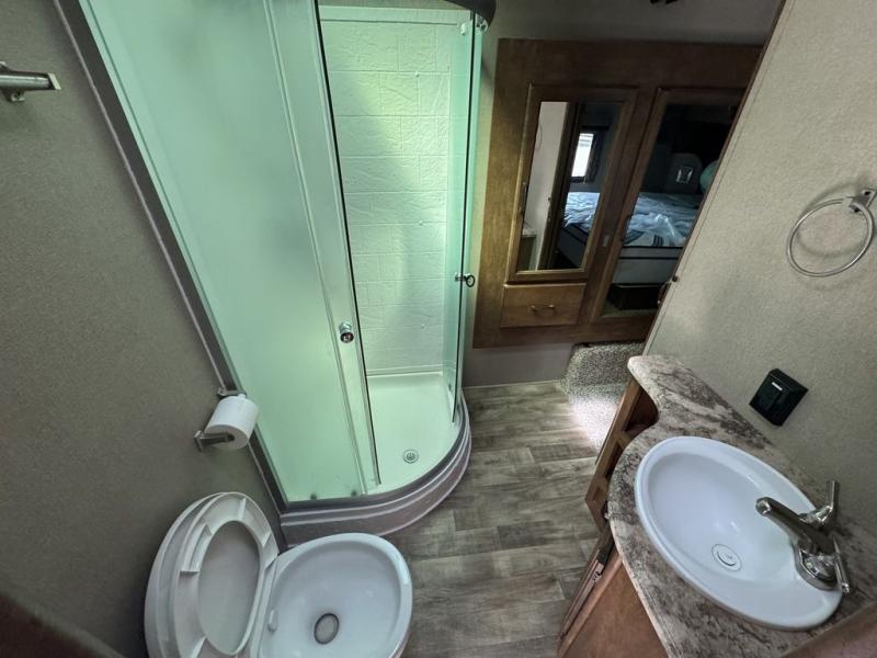 Head up the steps to the right of the entry door to find a side aisle bath with a radius shower including a skylight, toilet, vanity with sink, and linen cabinet within the bedroom slide. The rear bath also features a second entry door that slides open to allow access into the master bedroom.