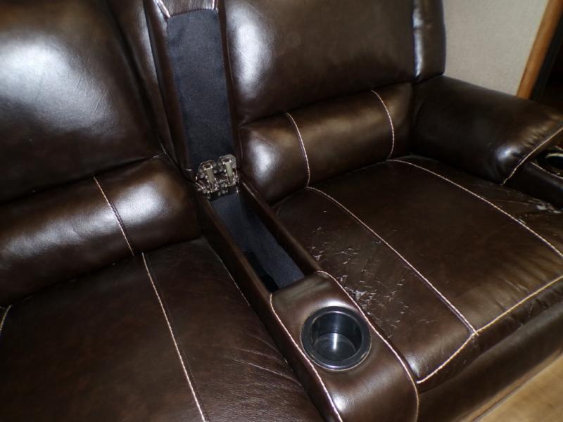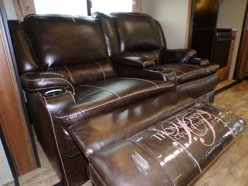 The slide opposite the door side features even more seating with theatre seats for two including cup holders and overhead cabinets for your things. There is also a refrigerator, and three burner range with convection microwave oven within the slide out too. Along the interior living area wall find a countertop with a kitchen sink, overhead storage, plus lower cupboards and drawer space for dishes and things.