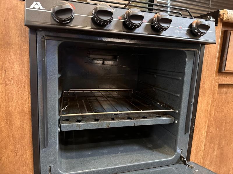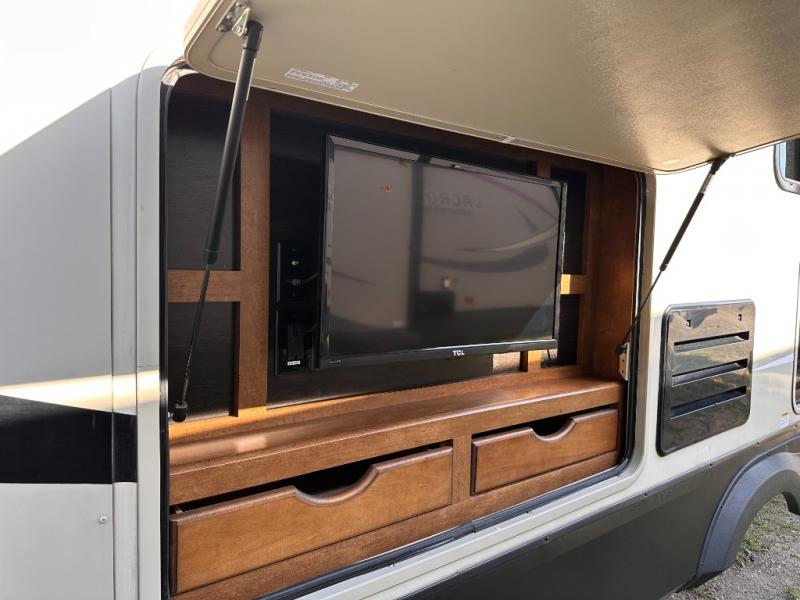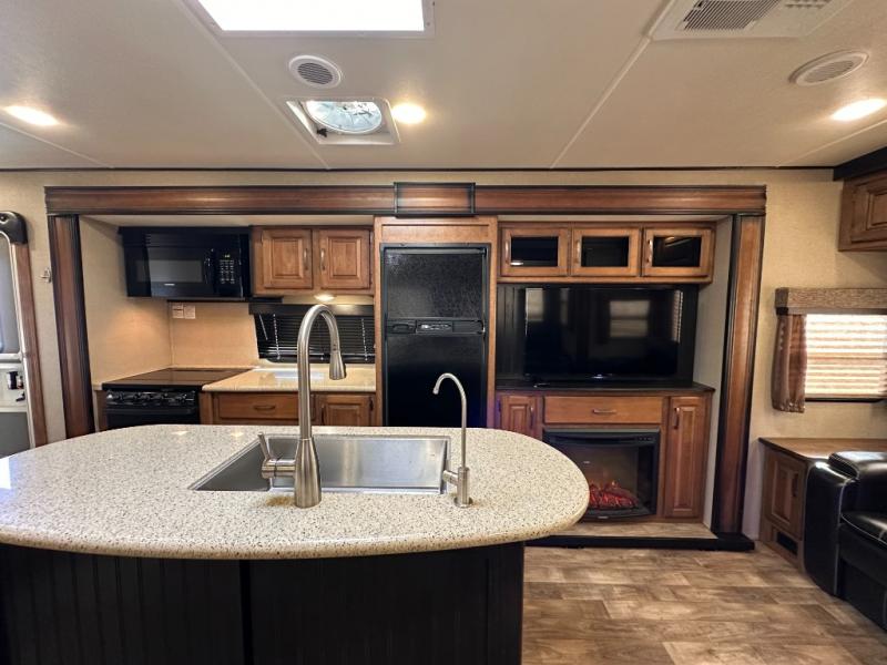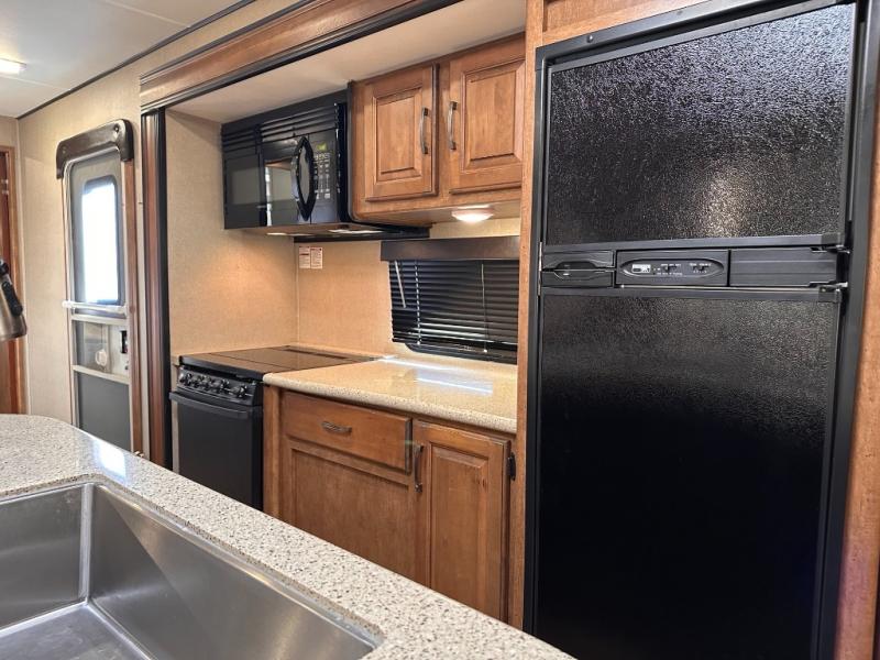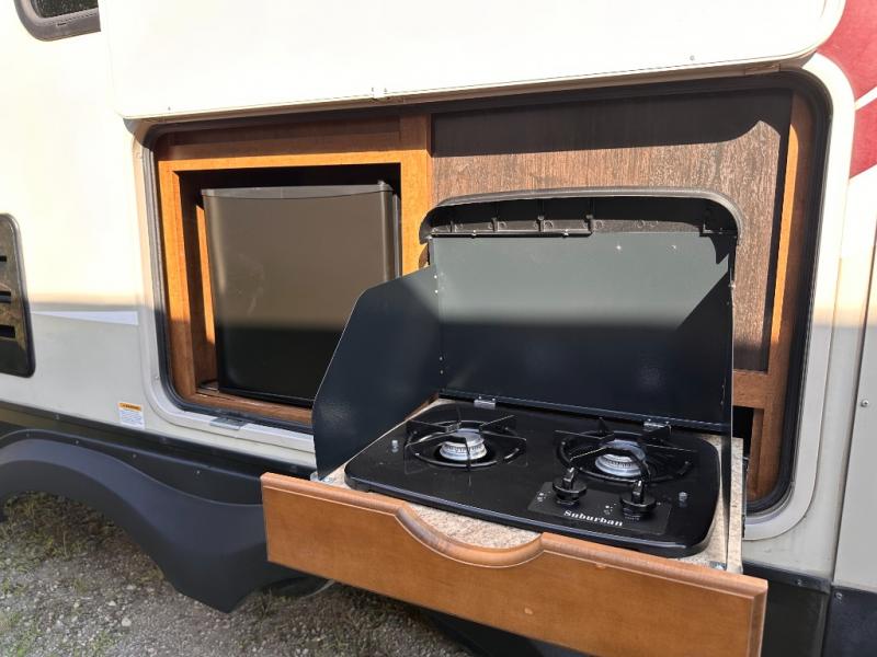 On the outside before heading in notice the exterior entertainment center with LED TV, and the outside kitchen including a two burner stove top and refrigerator to make outdoor cooking simple for the camp chef.