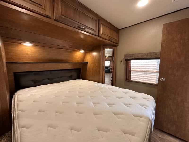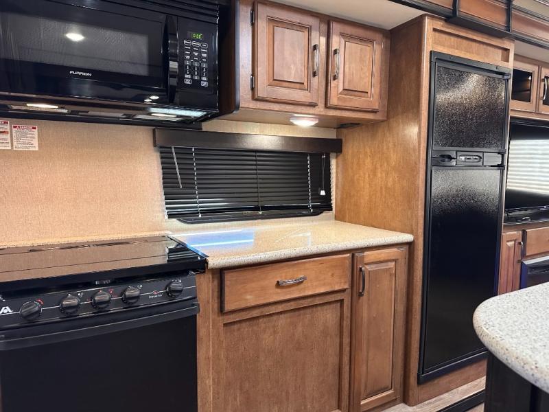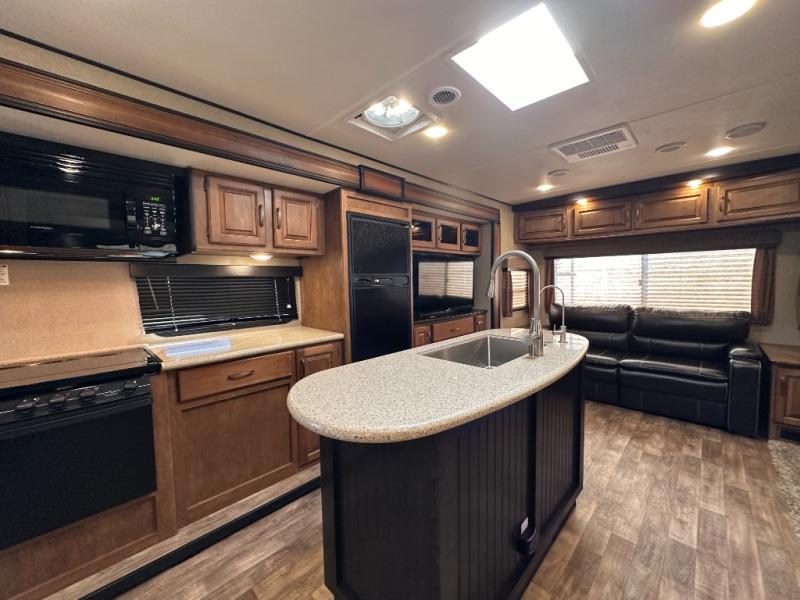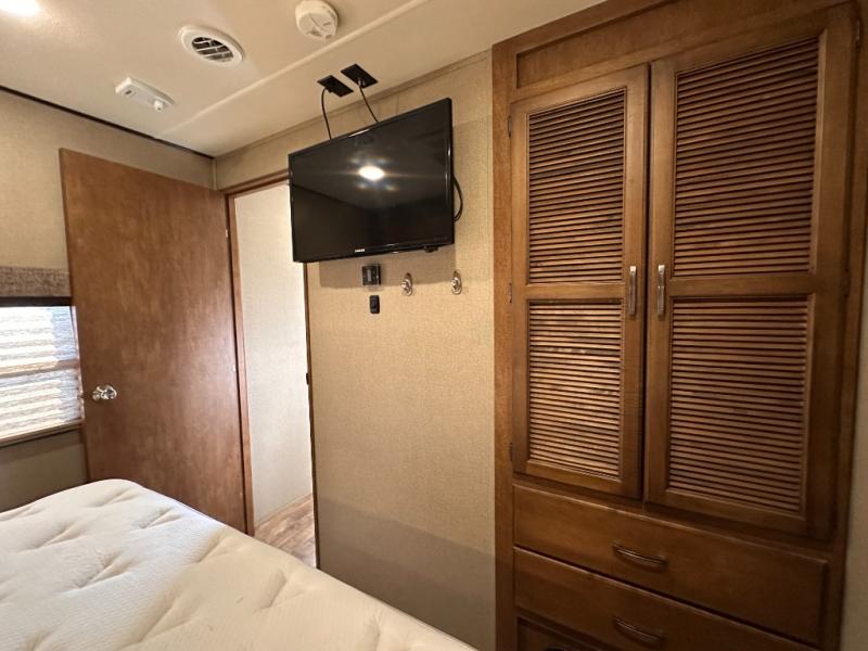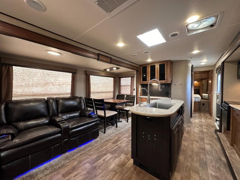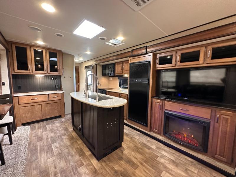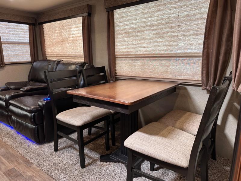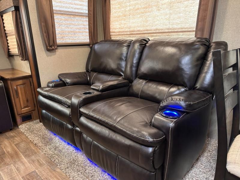 The rear portion of the curb side slide out features a 40" TV, and an entertainment center with fireplace below. Adjacent enjoy a tri-fold sofa, end tables and overhead cabinets that stretch the entire width of the unit. This can easily be made into sleeping space at night, and there is more seating in the theatre seats next to the dinette slide out which is opposite the entertainment center, plus so much more!